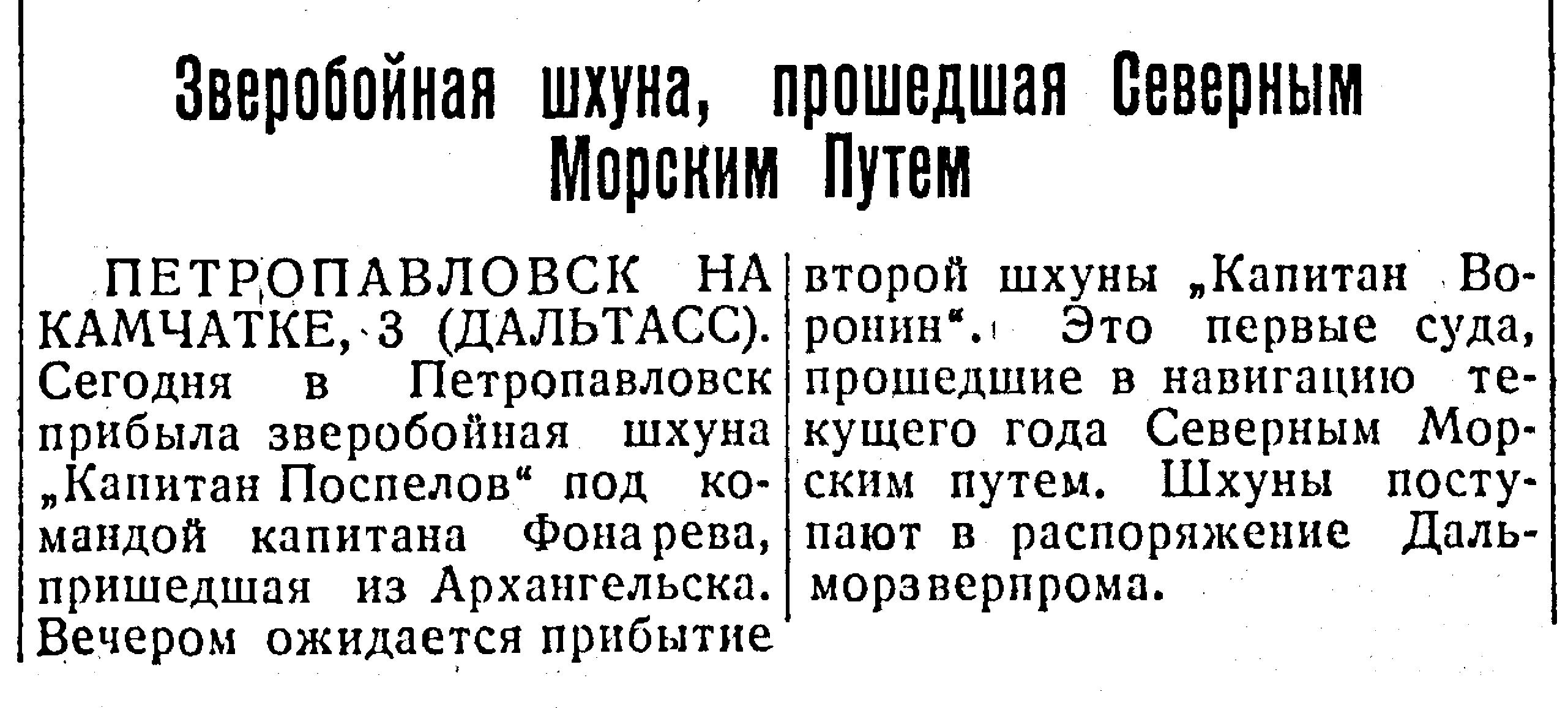 ПЕТРОПАВЛОВСК НА КАМЧАТКЕ, 3 (ДАЛЬТАСС). Сегодня в Петропавловск прибыла зверобойная шхуна "Капитан Поспелов" под командой капитана Фонарева, пришедшая из Архангельска. Вечером ожидается прибытие второй шхуны "Капитан Воронин". Это первые суда, прошедшие в навигацию текущего года Северным Морским путем. Шхуны поступают в распоряжение Дальморзверпрома.
