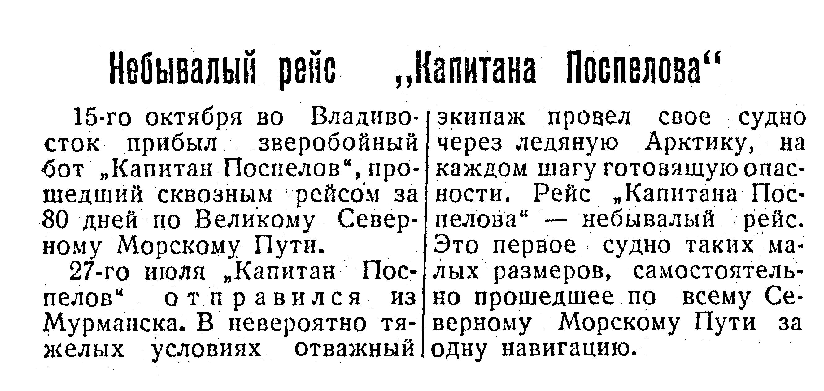 27-го июля „Капитан Поспелов" отправился из Мурманска. В невероятно тяжелых условиях отважный экипаж провел свое судно через ледяную Арктику, на каждом шагу готовящую опасности. Рейс "Капитана Поспелова" — небывалый рейс. Это первое судно таких малых размеров, самостоятельно прошедшее по всему Северному Морскому Пути за одну навигацию.