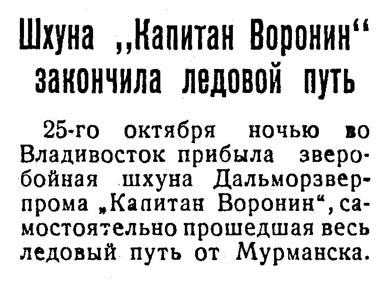 25-го октября ночью во Владивосток прибыла зверобойная шхуна Дальморзвер-прома „Капитан Воронин", самостоятельно прошедшая весь ледовый путь от Мурманска.