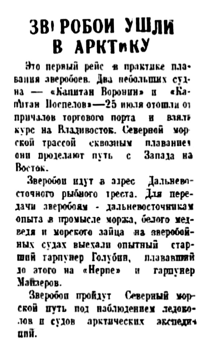Минувшим летом нарком пищевой промышленности тов. Микоян отдал приказ о переброске первых совет­ских ботов из Мурманска на Дальний Восток. До сих пор такие переходы совершались ботами кружным путем, через Индийский океан. Однако со­ветские капитаны тт. Фонарев («Ка­питан Поспелов») и Пудовкин («Ка­питан Воронин»), выполняя приказ наркома, предприняли сложнейший переход из Мурманска на Камчатку Северным морским путем. По этому курсу в 1932 году первым прошел, освоив трудный ледовый путь в одну навигацию, ледокол «Сибиряков».