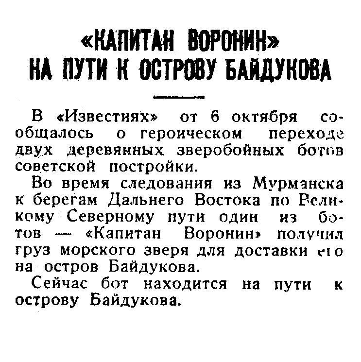 В «Известиях» от 6 октября сообщалось о героическом переходе двух деревянных зверобойных ботов советской постройки.