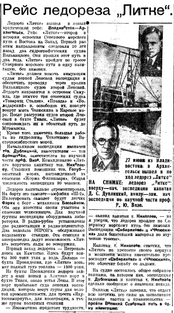 27 июня * из Владивостока в Архангельск вышел в поход ледорез "Литке". НА СНИМКЕ: ледорез "Литке": вверху — нач. экспедиции капитан Д. С. Дуплицкий, внизу — зам. нач экспедиции по научной части проф.В. Ю. Визе.