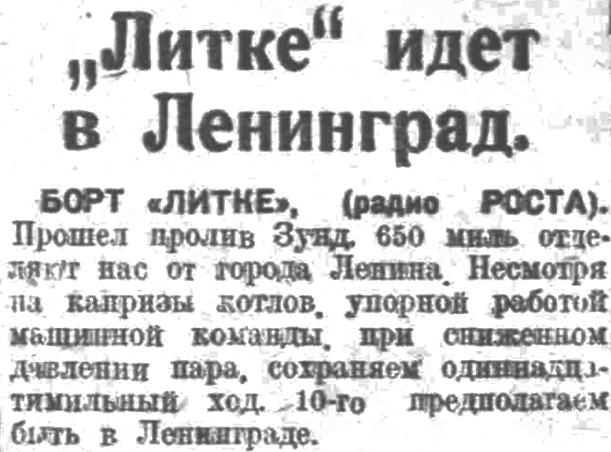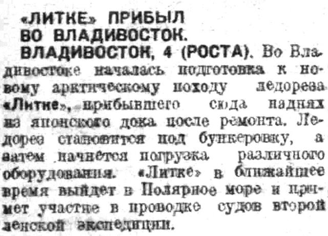 БОРТ «ЛИТКЕ», 4 (РОСТА). «Литке» — в Японском мюре. За первые сутки пройдено 235 миль. При выходе из Владивостокского порта весь экипаж ледореза и состав экспедиции участвовали в аврале, крепя грузы в виду надвигающегося сильного волнения со стороны Охотского моря.
