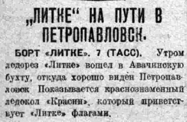 БОРТ «ЛИТКЕ». 7 (ТАСС). Утром ледорез «Литке» вошел в Авачинскую бухту, откуда хорошо видев Петропавловск. Показывается краснознаменный ледокол «Красин», который приветствует «Литке» флагами.