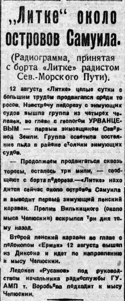 6-то августа, в 9 часов утра, «Литке» бросил якорь в самом северном порту мира — в бухте Тикси. Взяв здесь уголь, «Литке» двинулся дальше, преодолевая тяжелые льды. 12-го августа навстречу ледорезу вышла группа зимовщиков Северной земли во главе с геологом Урванцевым. Около островов Самуила «Лите» занялся выводкой зимующего здесь первого Ленского каравана.