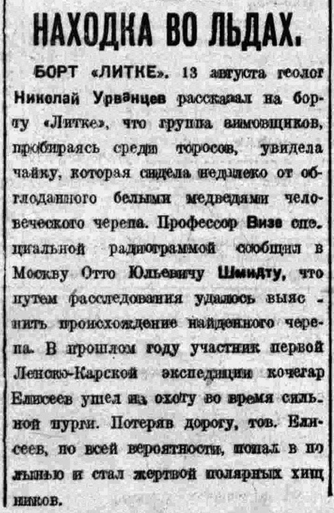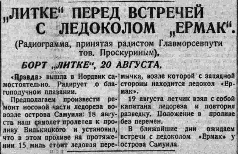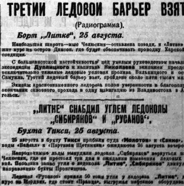 С большевистской настойчивостью под умелым руководством начальника экспедиции Дуплицкого и капитана Николаева экипажем преодолены исключательно тяжелые ладовые условия пролива Вилькицкого и острова Самуила. Третий ледовый барьер взят, пройдено около пята тысяч миль.