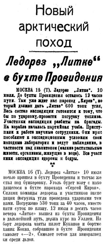 МОСКВА 15 (Т). Ледорез "Литке". 10 июля. До бухты Провидения осталось 12 часов пути. Там уже ждет нас пароход „Киров", который должен дать "Литке" 600 тонн угля, Вась состав экспедиции готовится к тому, чтобы по ударному провести погрузку топлива. Участники экспедиции разбиты на бригады. На корабле началась партийная учёба. Приступили к работе научные сотрудника. Они приспособляют к экспедиционным условиям свои походные лаборатории и ведут наблюдение, в частности над планктоном (мелкие растительные животн. организмы, живущие в воде). Все участники экспедиции здоровы и бодры.