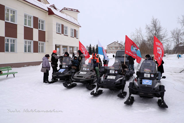 После митинга и официальных речей, четыре боевых машины, очищенные священным дымом ненецкого обряда, под «Марш славянки» пересекли улицу Первомайскую и спустились на замёрзшую Печору. Практически никем не замеченный, под шумок и дымок, за ними отправился ещё один снегоход. В команде «вольнонаёмных» – депутат Архангельского областного Собрания от НАО Матвей Чупров, в качестве информационного сопровождения – корреспондент ВНАО. В походном порядке пять снегоходов двинулись к первой точке маршрута – селу Тельвиска, через которую в годы войны проходил путь оленетранспортных эшелонов.