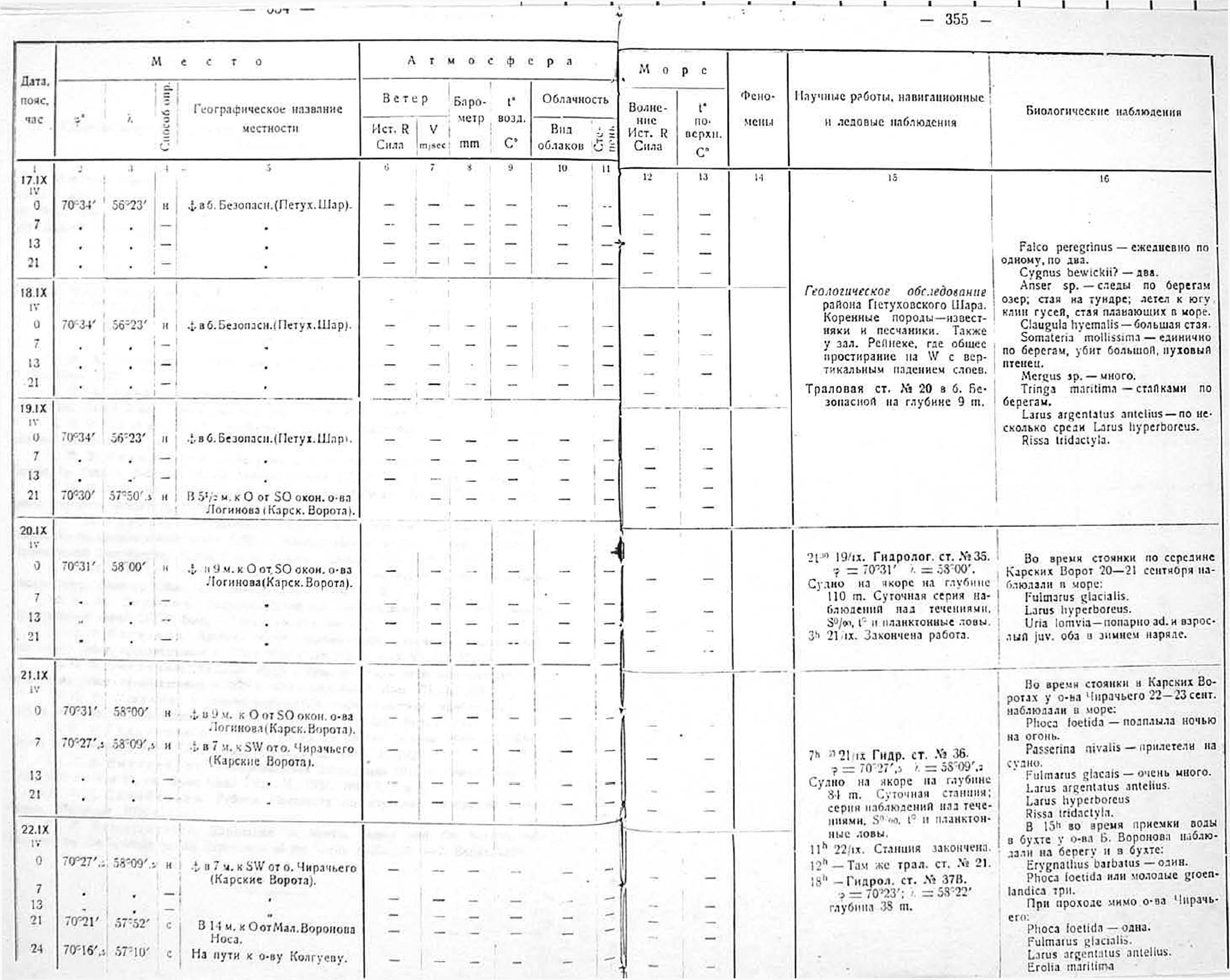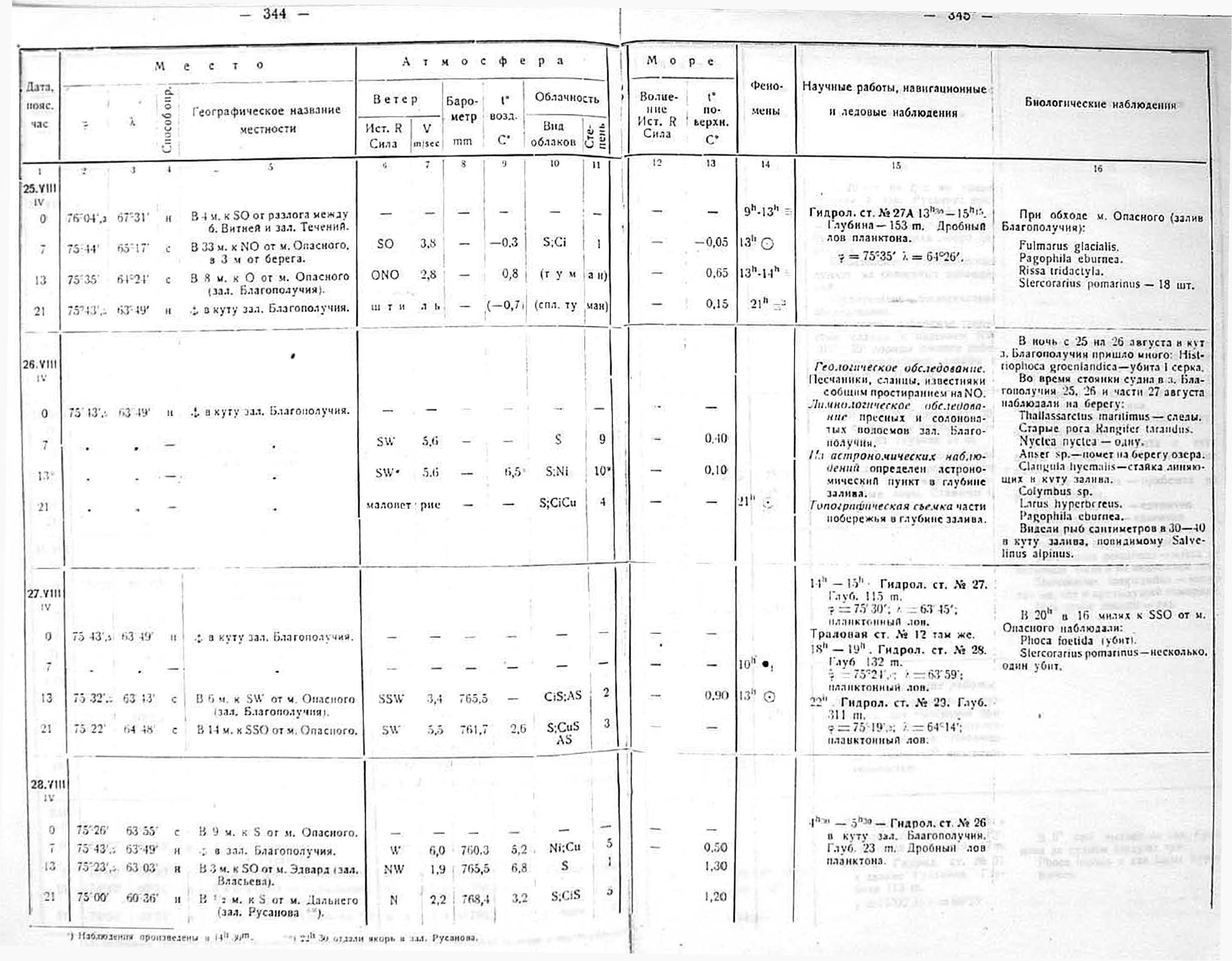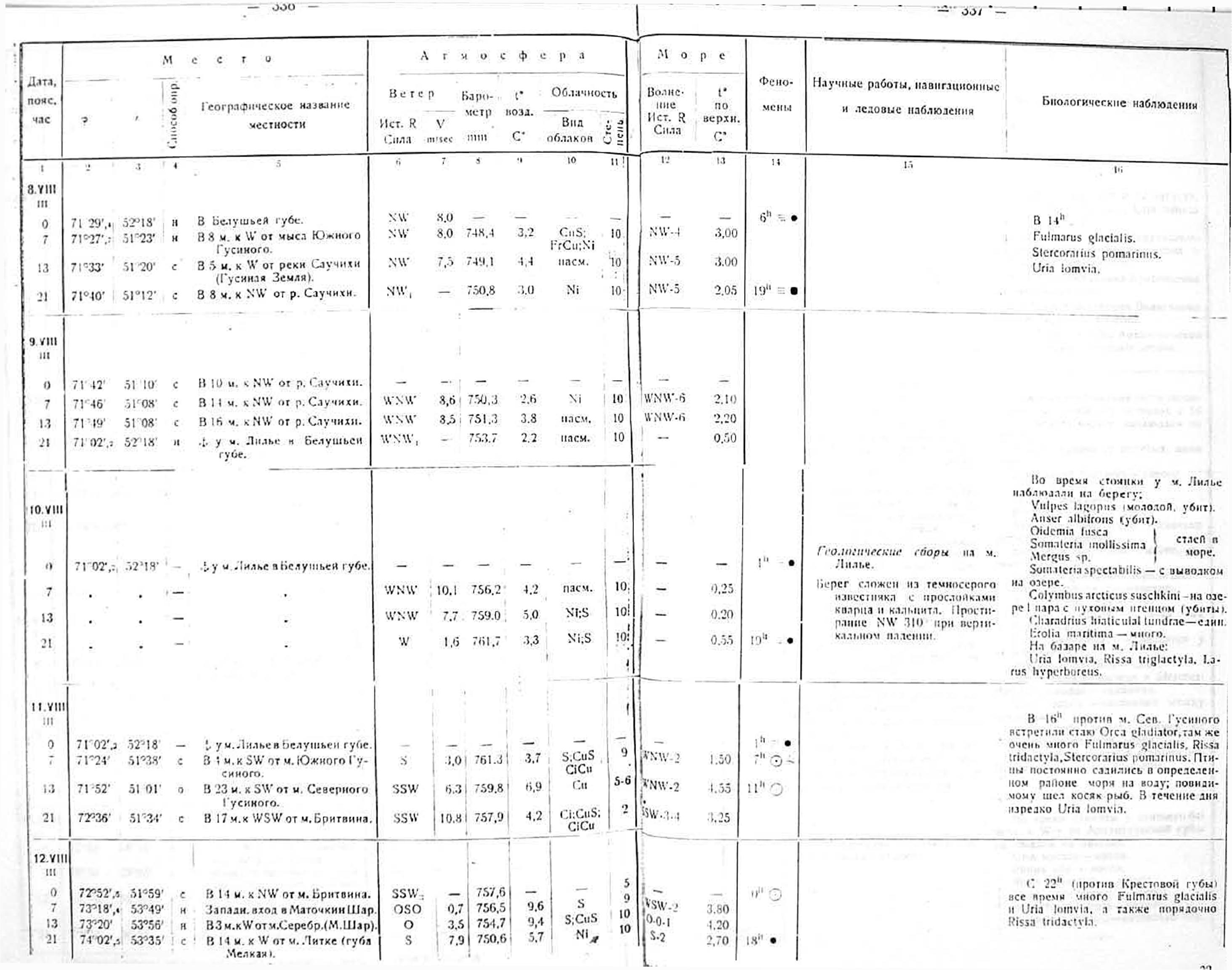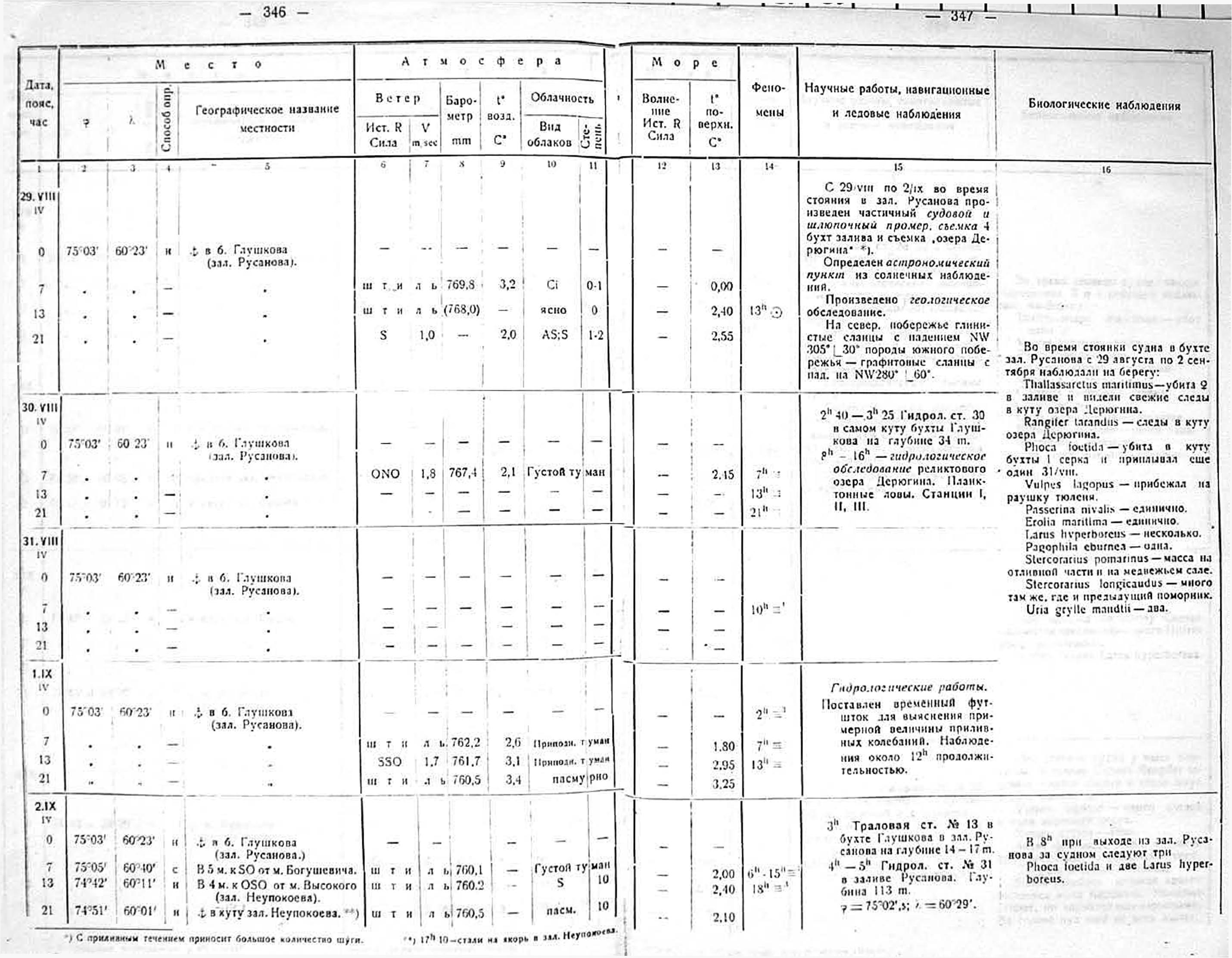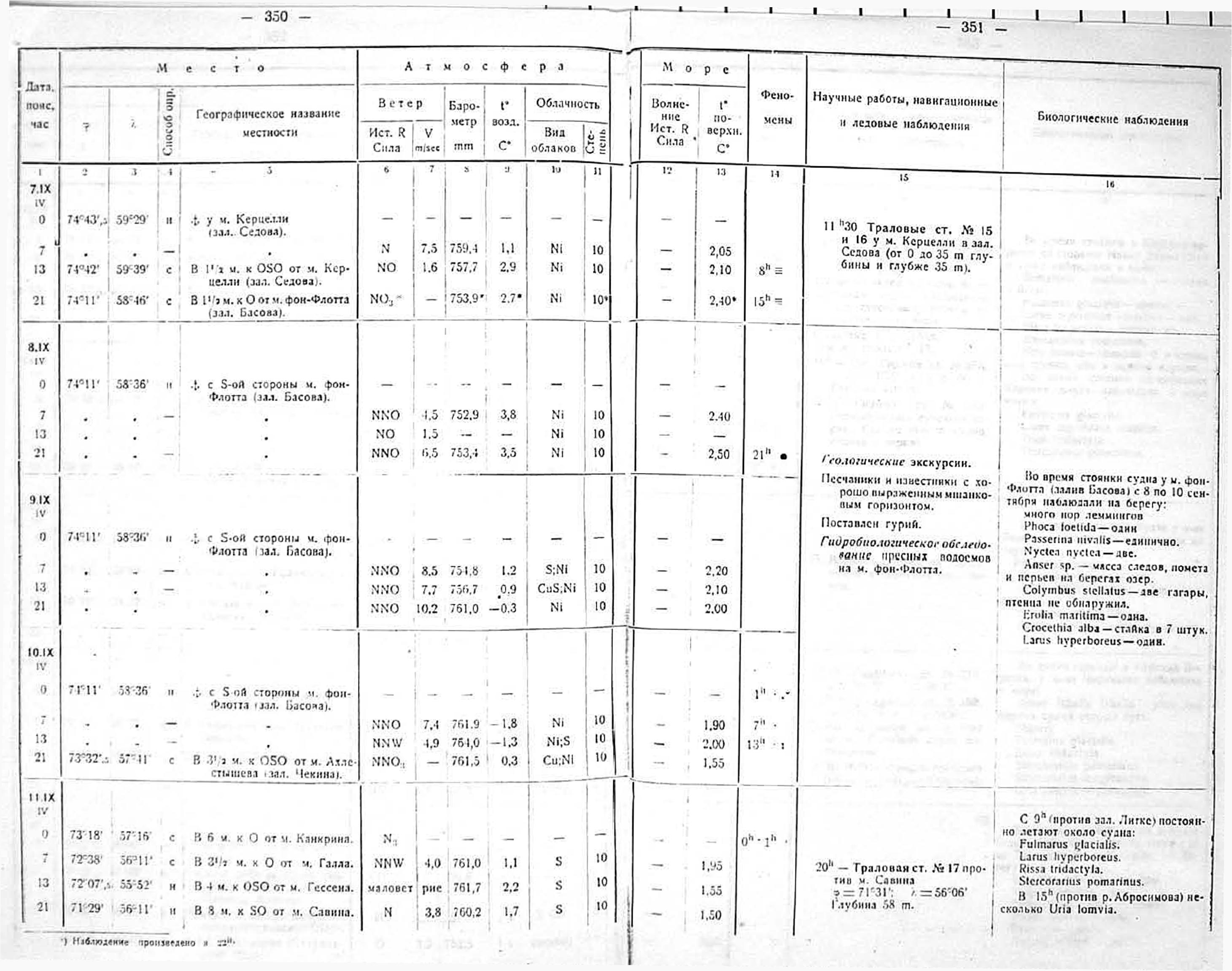 Метеорологические наблюдения производились попеременно научными сотрудниками экспедиции три раза в сутки: в 7, 13 и 21 час. поясного времени. Во время якорных стоянок судна и на гидрологических станциях нередко весь немногочисленный научный персонал бывал занят — отсюда ряд вынужденных пропусков в наблюдениях.