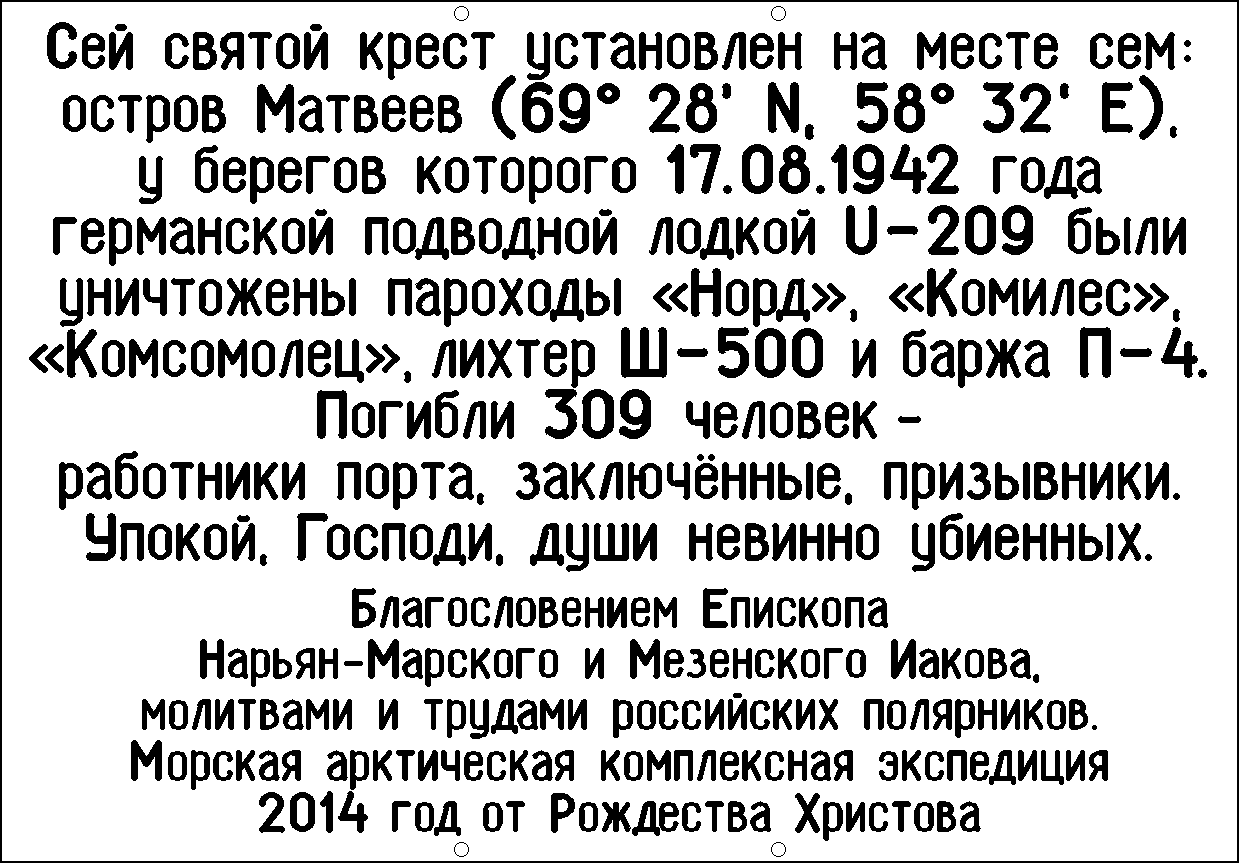 Экспедиция вернулась, чуть позже напишу подробнее. А сейчас хочу выложить мемориальные доски, которые были установлены на крестах, установленных участниками экспедиции на островах Матвеев и Долгий в Печорском море Ненецкого АО.