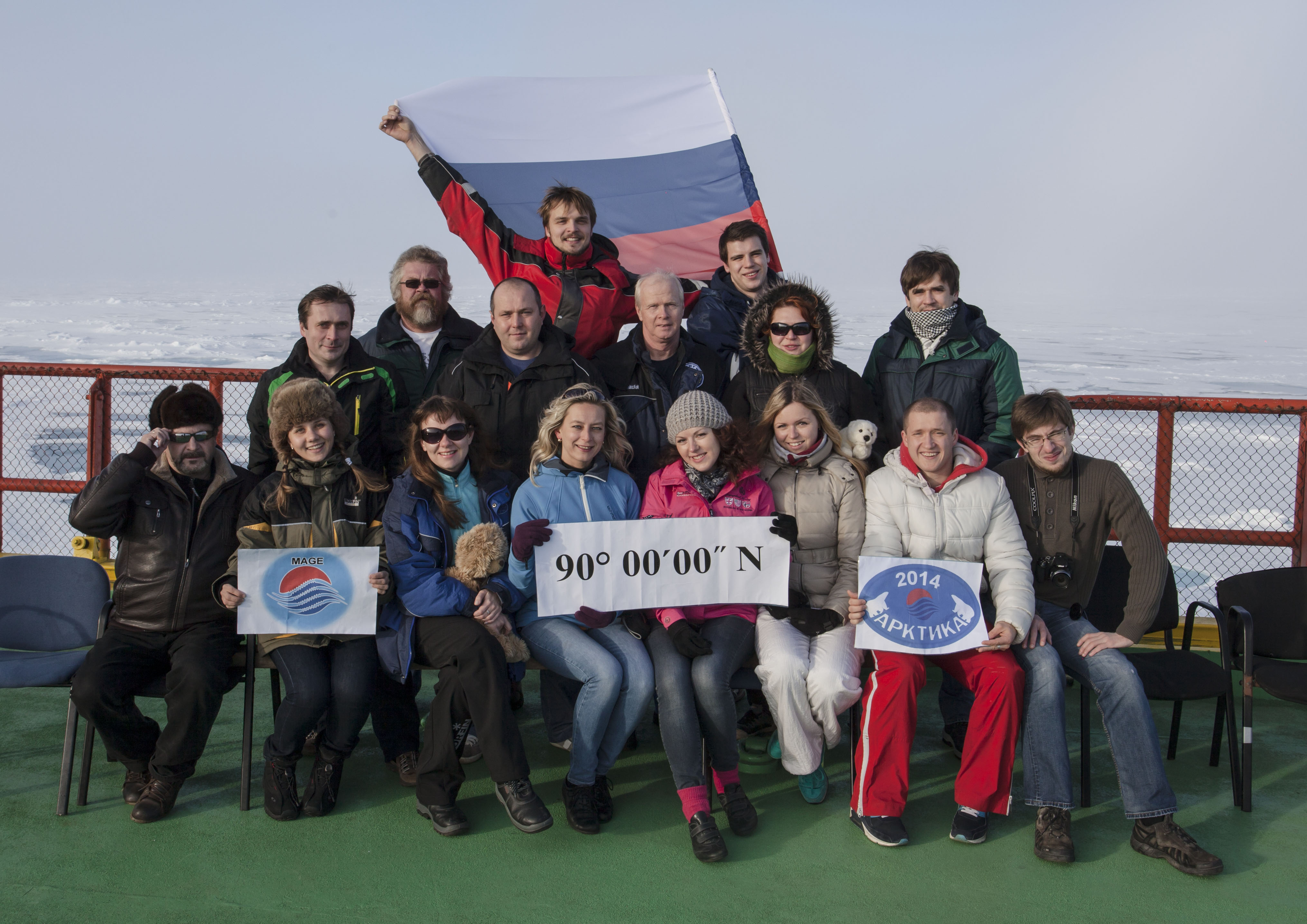 15 августа со стрельбой прошли через Северный полюс. Это было 48-е достижение полюса «Ямалом», 4-е – «Федоровым» и 13-е – мною. Полюс прошли ходом, без остановки, с ритуальной фотосъемкой дружного коллектива на вертолетной площадке и поеданием арбуза в моей каюте :) . На следующий день остановились, «особо выдающиеся» члены экспедиции были спущены на лед для официальной съемки с флагом. Впервые в истории сейсмические работы были выполнены на полюсе. Кстати в это же время канадцы на двух ледоколах работали в этом же районе («Луи Сен Лоран» и «Терри Фокс») с теми же задачами. Но на полюсе они были после нас только через 12 суток.
