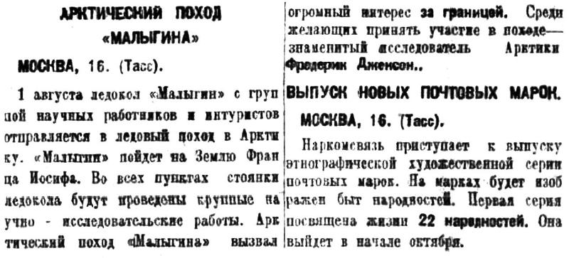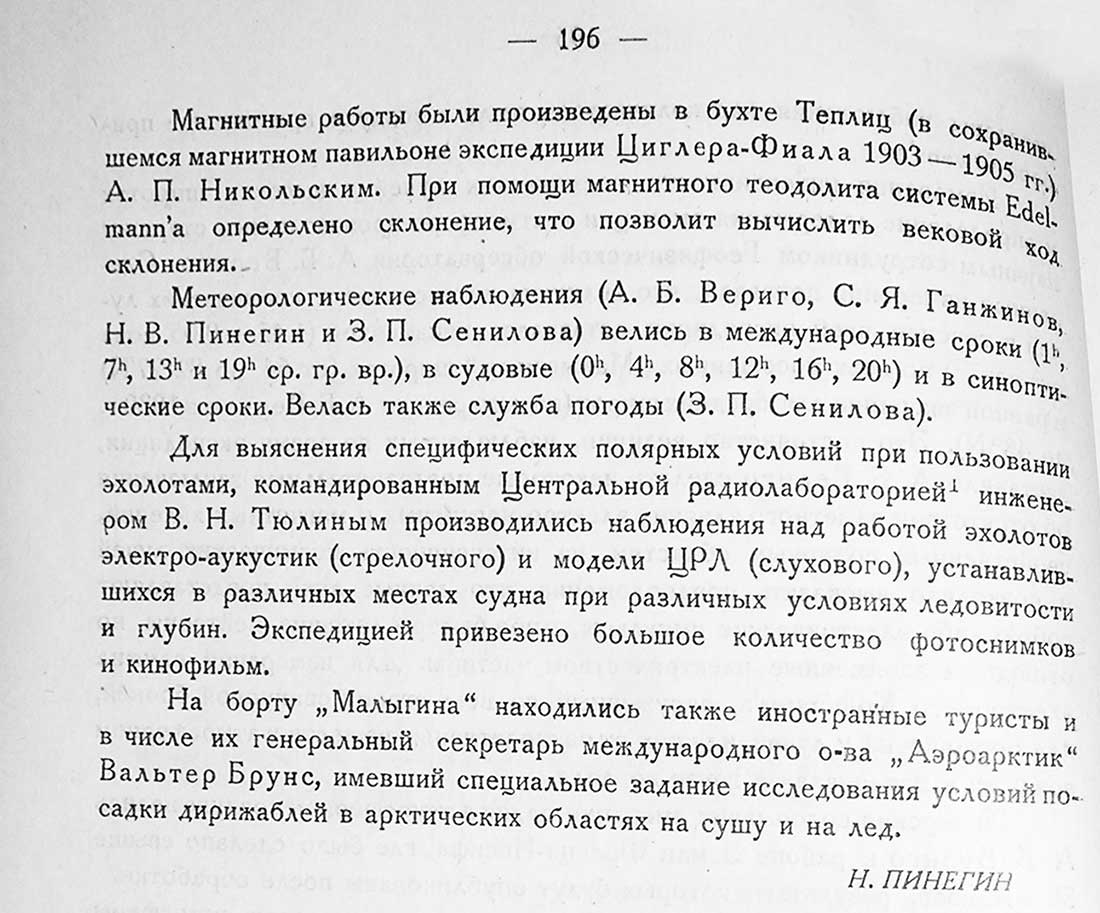 На борту „Малыгина“ находились также иностранные туристы и в числе их генеральный секретарь международного о-ва „Аэроарктик" Вальтер Брунс, имевший специальное задание исследования условий посадки дирижаблей в арктических областях на сушу и на лед.