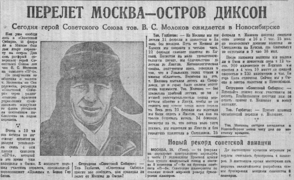 21 февраля с московского центрального аэродрома стартовал на самолете ПР-5 герой Советского Союза т. МОЛОКОВ. Молоков летит через Казань, Свердловск, Омск, Новосибирск, Красноярск, Иркутск, Читу на острое Диксон.