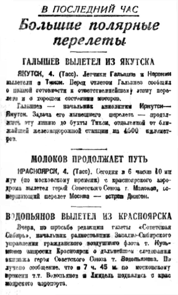КРАСНОЯРСК. 4. (Тасс). Сегодня в 6 часов 10 минут (по московскому времени) с Красноярского аэродрома вылетел герой Советского Союза т. Молоков, совершающий перелет Москва — остров Диксон.