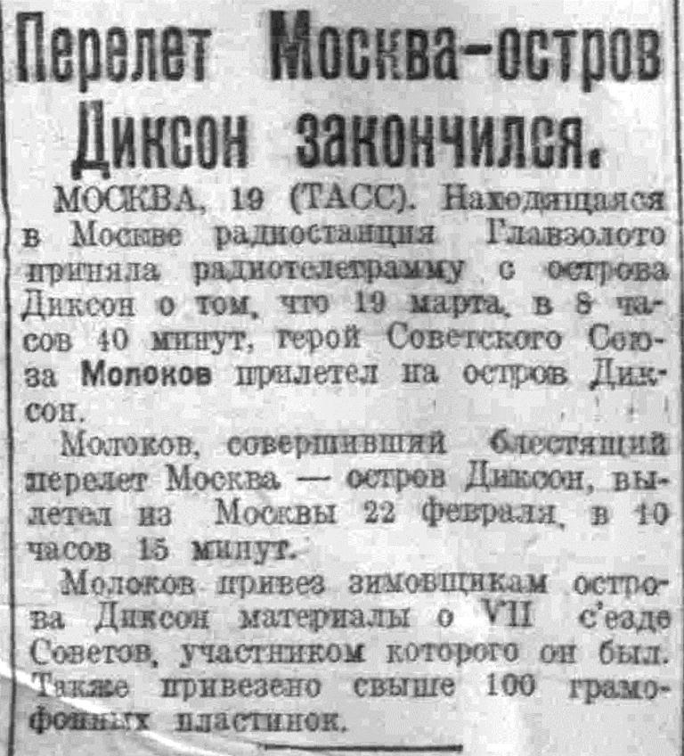 МОСКВА, 19 (ТАСС). Находящаяся в Москве радиостанция Главзолото приняла радиотелеграмму с острова Диксон о том, что 19 марта, в 8 часов 40 минут, герой Советского Союза Молоков прилетел на остров Диксон. Молоков, совершивший блестящий перелет Москва — остров Диксон, вылетел из Москвы 22 февраля. в 10 часов 15 минут.