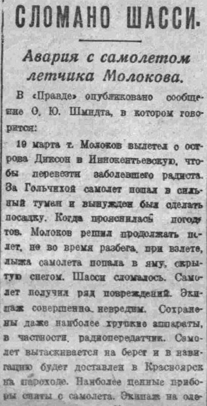 19 марта т. Молоков вылетел о острова Диксон в Иннокентьевскую. чтобы перевезти заболевшего радиста. За Гольчихой самолет попал в сильный туман и вынужден был сделать посадку. Когда прояснилась погода тов. Молоков решил продолжать полет, но во время разбега, при взлете, лыжа самолета попала в яму, скрытую снегом. Шасси сломалось. Самолет получил ряд повреждений. Экипаж совершенно, невредим. Сохранены даже наиболее хрупкие аппараты, в частности, радиопередатчик. Самолет вытаскивается на берег и в навигацию будет доставлен в Красноярск на пароходе. Наиболее ценные приборы сняты с самолета. Экипаж на оленях выезжает в село Караул