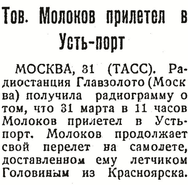МОСКВА, 31 (ТАСС). Радиостанция Главзолото (Москва) получила радиограмму о том, что 31 марта в 11 часов Молоков прилетел в Усть-Порт, Молоков продолжает свой перелет на самолете, доставленном ему летчиком Головиным из Красноярска.