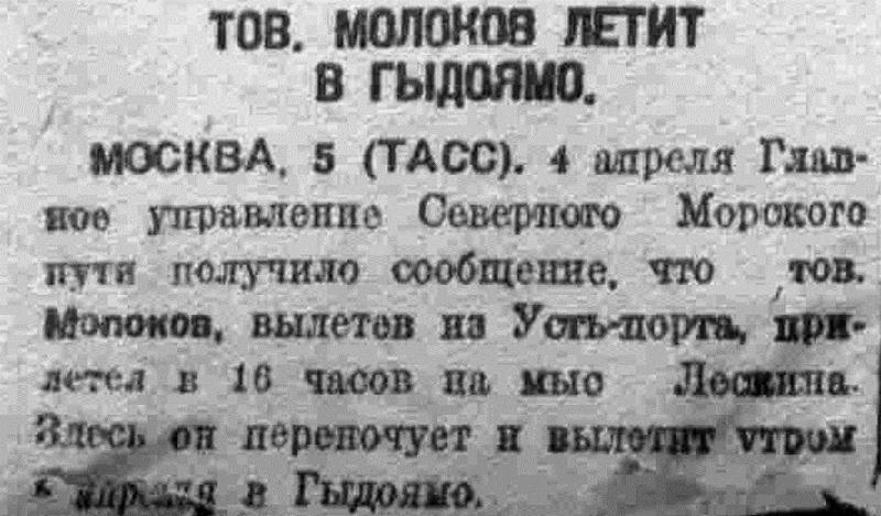 4 апреля главное управление Северного морского пути получило сообщение, что т. Молоков, вылетев из Усть-Порта, прилетел в 16 час. на мыс Лескина. Здесь он переночует и вылетит утром 5 апреля в Гыдоямо.