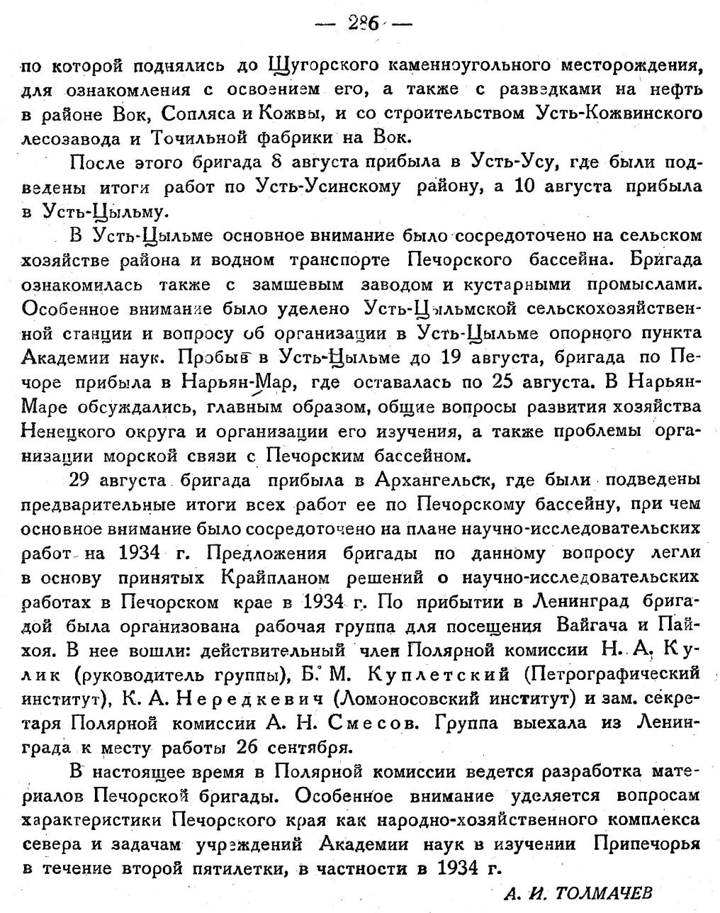 В настоящее время в Полярной комиссии ведется разработка материалов Печорской бригады. Особенное внимание уделяется вопросам характеристики Печорского края как народно-хозяйственного комплекса севера и задачам учреждений Академии наук в изучении Припечорья в течение второй пятилетки, в частности в 1934 г.