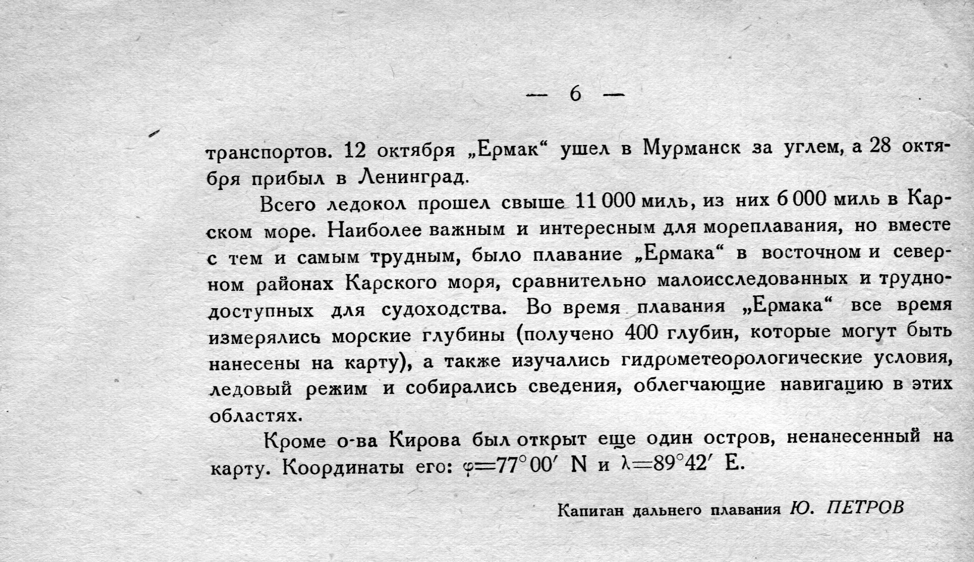 Всего ледокол прошел свыше 11 000 миль, из них 6 000 миль в Карском море. Наиболее важным и интересным для мореплавания, но вместе с тем и самым трудным, было плавание „Ермака" в восточном и северном районах Карского моря, сравнительно малоисследованных и труднодоступных для судоходства. Во время плавания „Ермака" все время измерялись морские глубины (получено 400 глубин, которые могут быть нанесены на карту), а также изучались гидрометеорологические условия, ледовый режим и собирались сведения, облегчающие навигацию в этих областях.