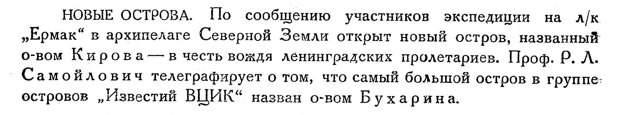 НОВЫЕ ОСТРОВА. По сообщению участников экспедиции на л/к „Ермак" в архипелаге Северной Земли открыт новый остров, названный о-вом Кирова — в честь вождя ленинградских пролетариев. Проф. Р. Л. Самойлович телеграфирует о том, что самый большой остров в группе островов „Известий ВЦИК“ назван о-вом Бухарина.