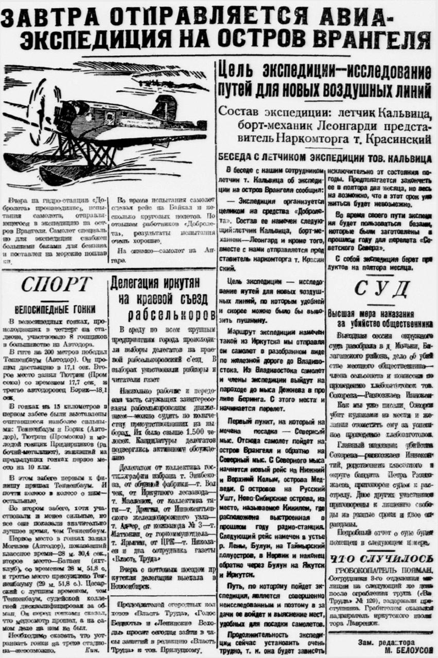 «Добролетом» получено сообщение, что самолет Северной экспедиции (на о. Врангеля) вышел из Булуна в Жиганск. По дороге сломался коленчатый вал мотора и самолёту пришлось сделать вынужденную посадку. Она прошла благополучно и сейчас самолет погружен на баржу и находится на пути в Якутск. Пилот экспедиции т. Кальвица ожидается на днях с очередным рейсом самолета линии Иркутск — Якутск.