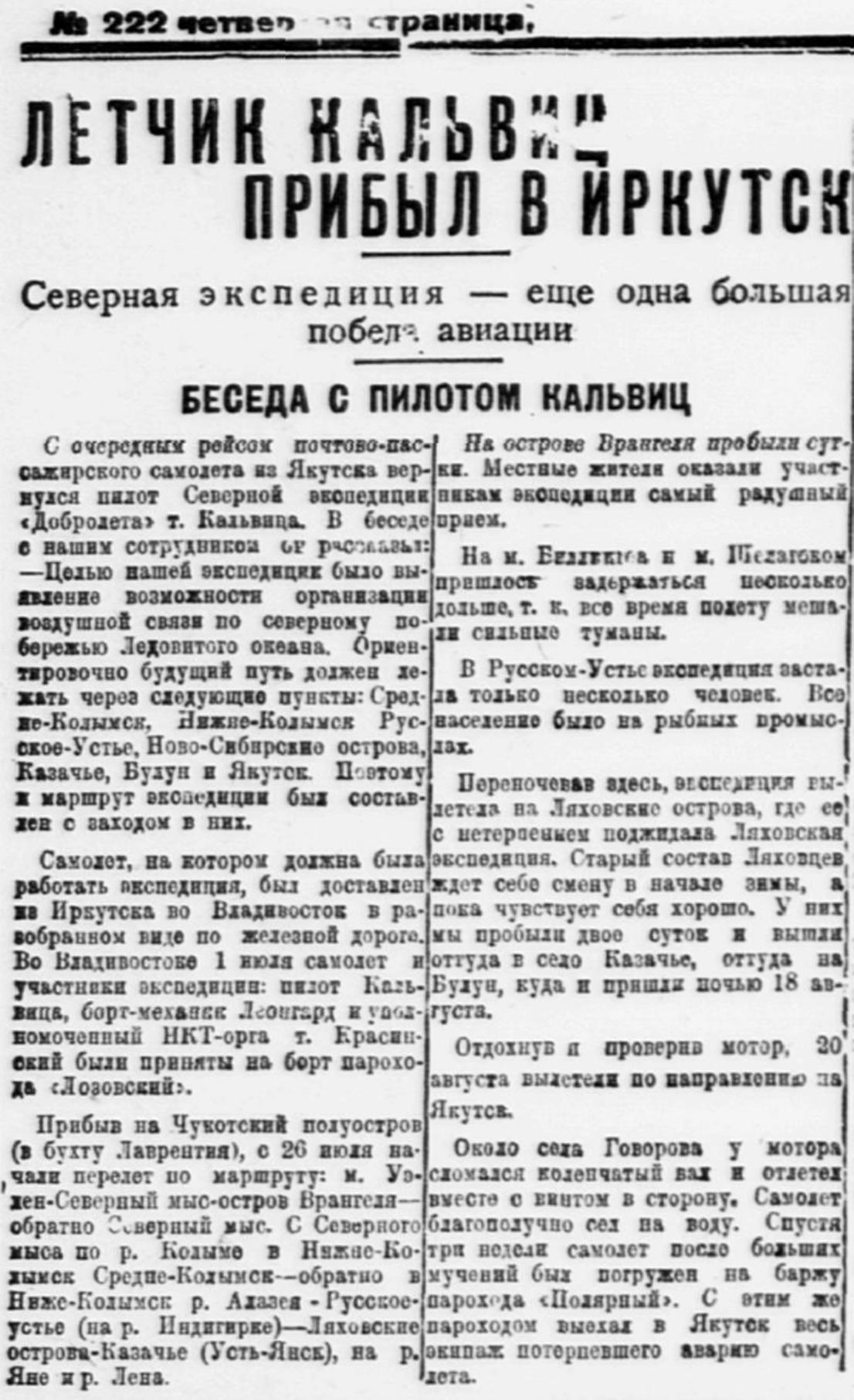 С очередным peйcoм почтово-пассажирского самолета из Якутска вернулся пилот Северной экспедиции «Добролета» т. Kальвицa. В беседе в нашим сотрудником он рассказал — Целью нашей экспедиции было выявление возможности организации воздушной связи по северному побережью Ледовитого океана. Ориентировочно будущий путь должен лежать через следующие пункты: Средне-Колымск, Нижне-Колымск, Русское-Устье, Ново-Сибирские острова, Казачье, Булун и Якутск. Поэтому и маршрут экспедиции был составлен с заходом в них.