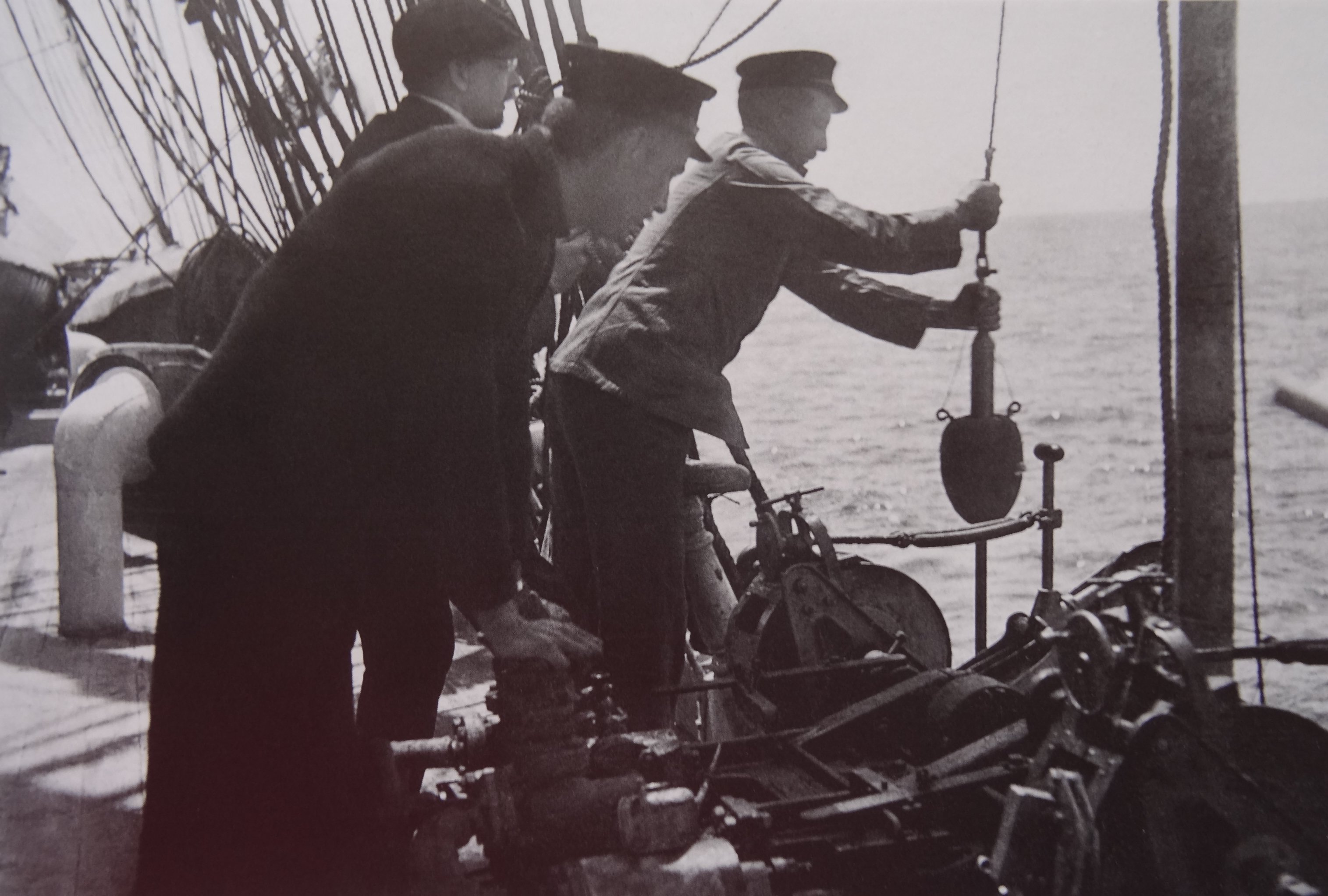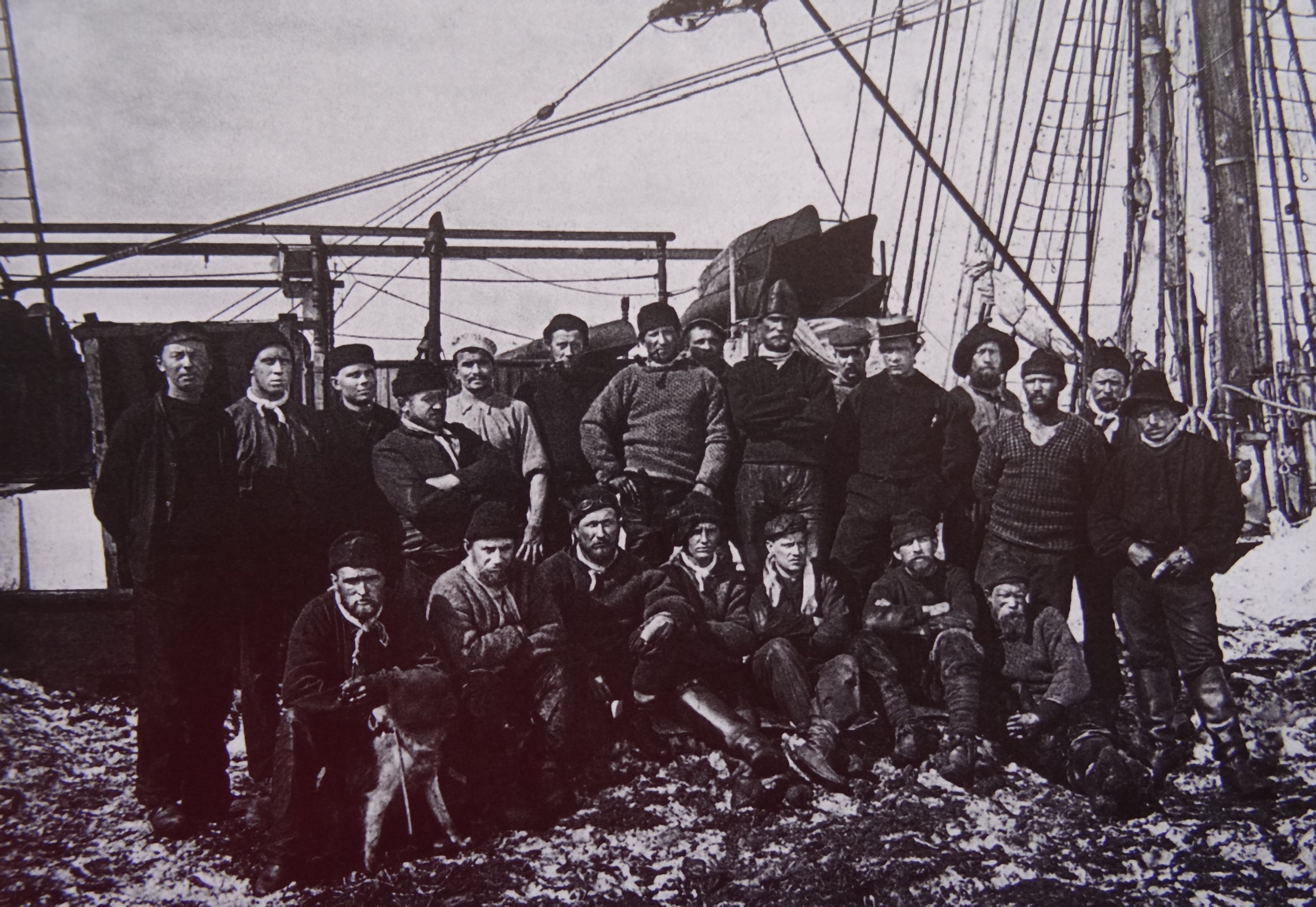 Офицерский и экспедиционный состав. Задний ряд, слева направо: Отт, Бидлингмайер, Верт, Гарцерт, Филиппи. Передний ряд, слева направо: Вазель, Ванхоффен, Дригальский, Рюсер (капитан судна), Лерхе.