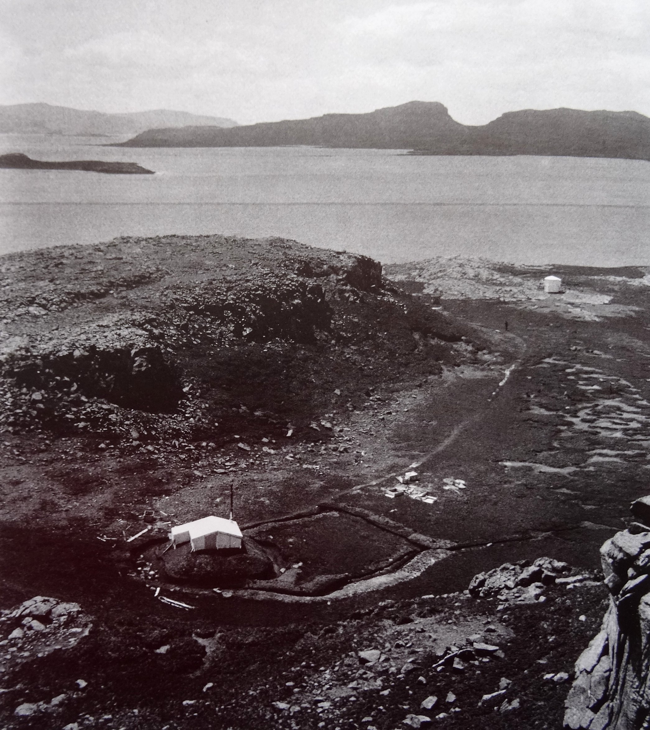 Станция экспедиции на о-вах Кергелен. На переднем плане основное здание, ближе к берегу - павильон абсолютных магнитных наблюдений.