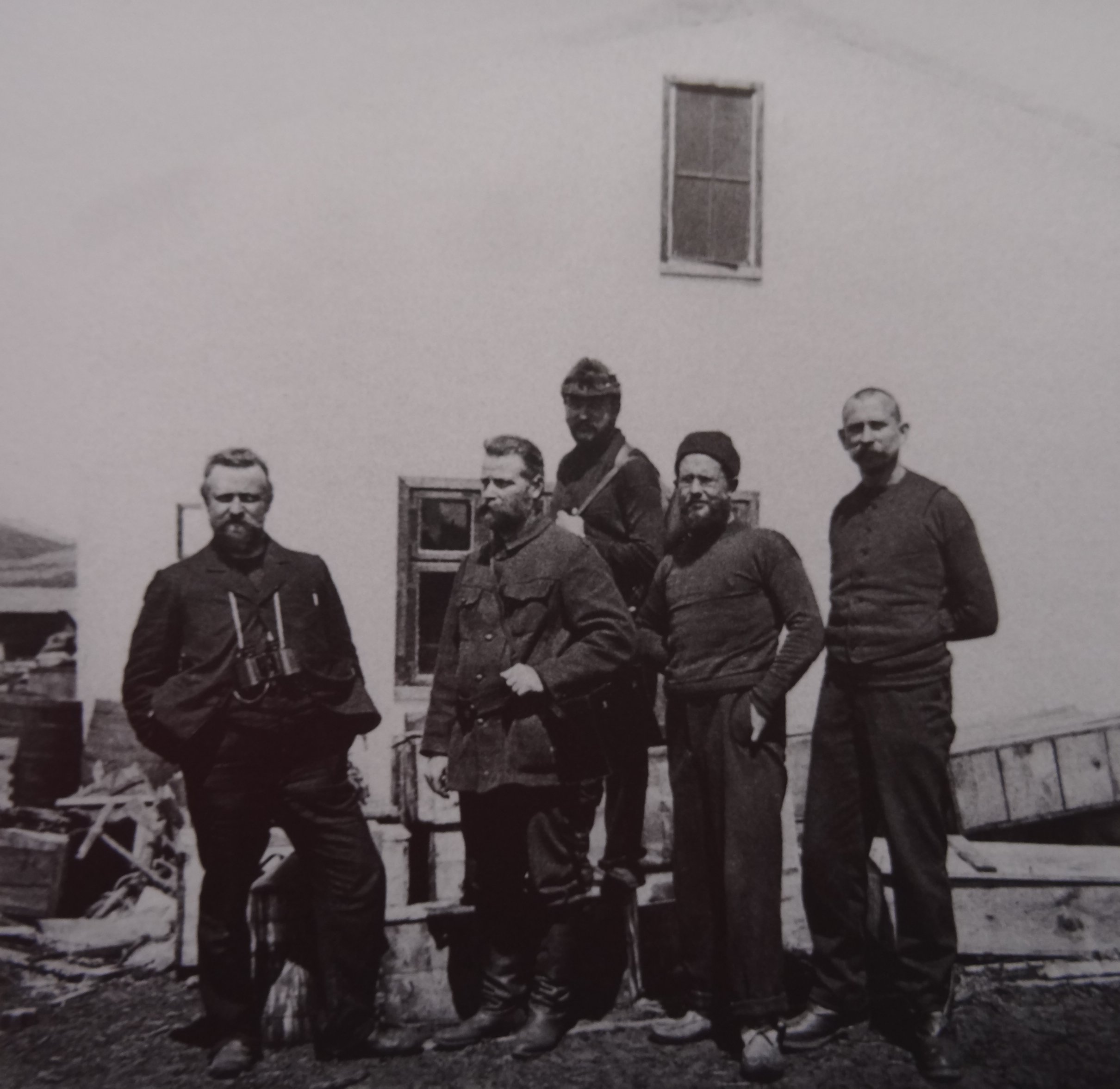 На крыльце магистрата Южной Георгии в Грютвикене, на обратном пути в Европу. Крайний слева в заднем ряду - Лоренцен. Первый ряд слева направо: Хайм, Мюллер, Барков.