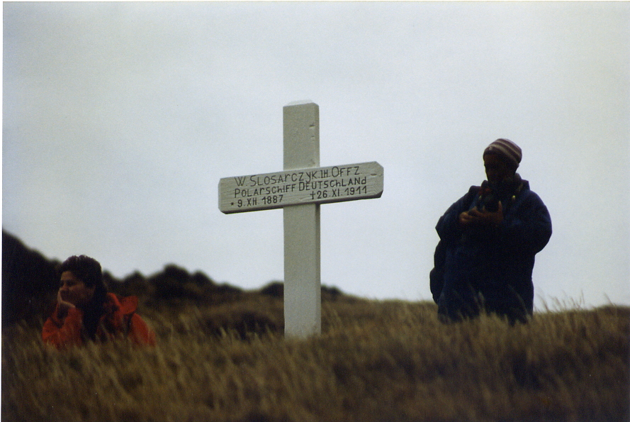 Крест, установленный в Грютвикене (Южная Георгия) в память третьего помощника "Дойчланд" Вальтера Шлоссарчика, пропавшего без вести во время короткого плавания на шлюпке с судна в британскую колонию Кинг Эдвард Пойнт. Черно-белое фото из книги К.Людеке, цветное - из Интернета. Станция Кинг Эдвард Пойнт находится на расстоянии менее 1 км от китобойной станции в Грютвикене, у них общая гавань. Вряд ли эта дистанция представляла какое-то затруднение для профессионального моряка. Данное обстоятельство дает повод говорить о самоубийстве Шлоссарчика. Этим в итоге объясняется тот факт, что крест-кенотаф установлен не на известном кладбище Грютвикена, а за его оградой на склоне берегового плато.