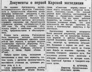 По заданию Арктического научно-исследовательского института Главсевморпути в Архангельском областном архиве выявлены интересные документы о первой Карской экспедиции (1920 г.). Среди разысканных документов большую ценность представляет протокол междуведомственного совещания при Архангельском губернском ревкоме, состоявшегося 15 мая 1920 года. На этом совещании обсуждался вопрос о снабжении экспедиции углем, продовольствием и обмундированием.