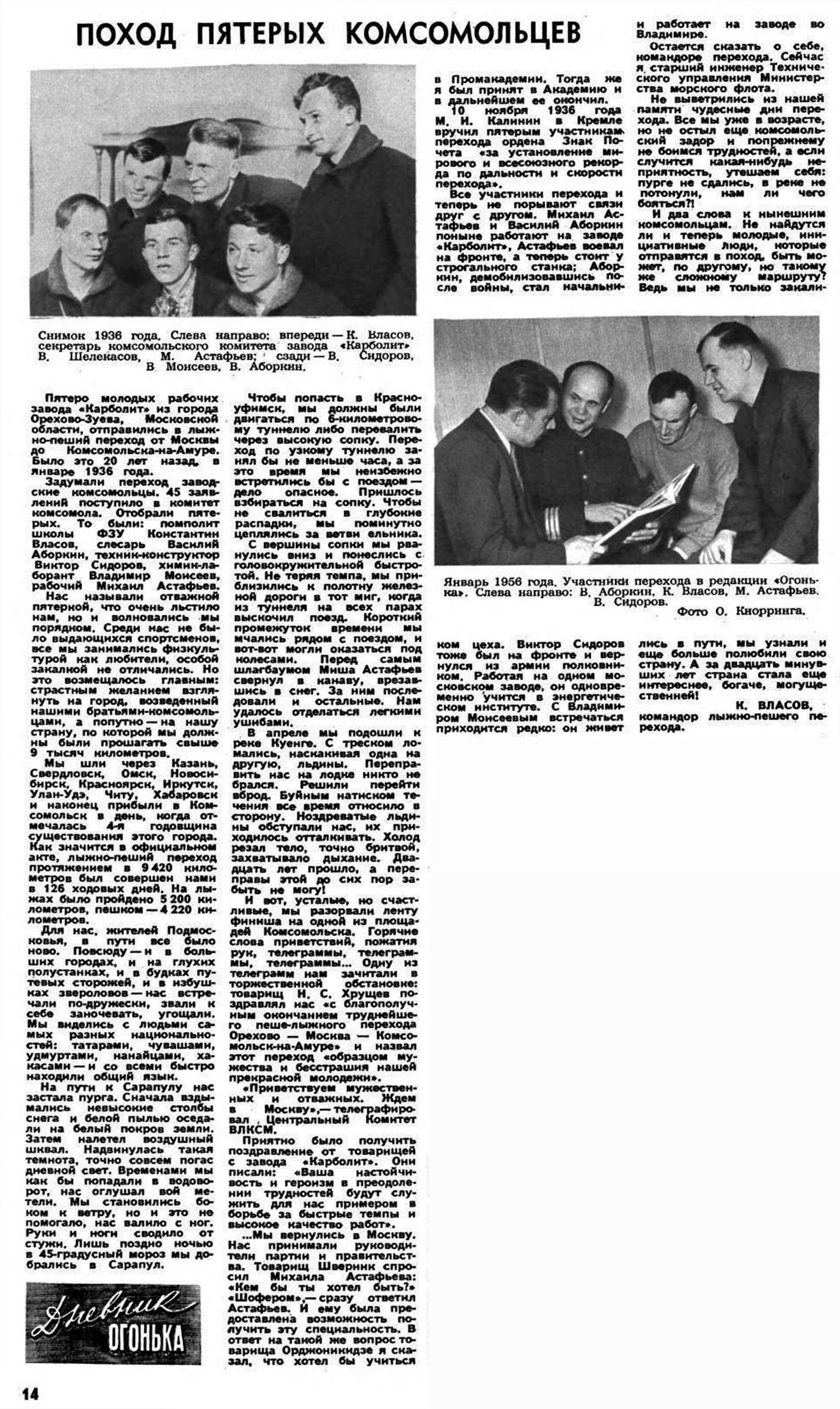 Пятеро молодых рабочих завода «Карболит» из города Орехово-Зуева, Московской области, отправились в лыжно-пеший переход от Москвы до Комсомольска-на-Амуре. Было это 20 лет назад, в январе 1936 года.