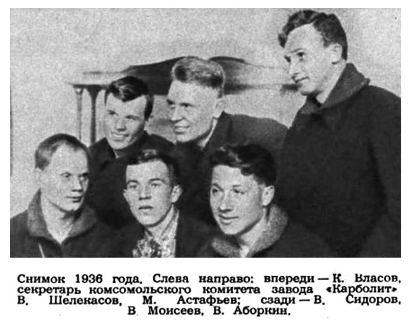 Снимок 1936 года. Слева направо: впереди — К. Власов, секретарь комсомольского комитета завода «Карболит» В. Шелекасов, М. Астафьев; сзади — В. Сидоров, В Моисеев, В. Аборкин.