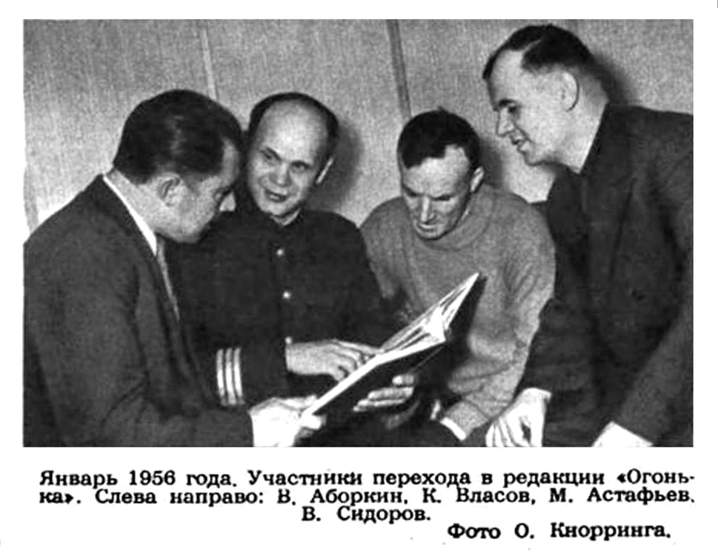 Январь 1956 года. Участники перехода в редакции «Огонька». Слева направо: В. Аборкин, К. Власов, М. Астафьев, В. Сидоров.