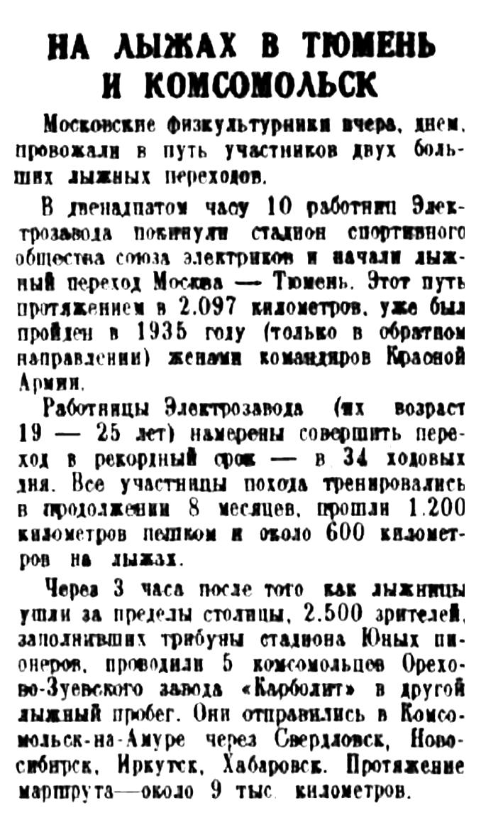 В двенадцатом часу 10 работниц Электрозавода покинули стадион спортивного общества союза электриков и начали лыжный переход Москва — Тюмень. Этот путь протяжением в 2.097 километров, уже был пройден в 1935 году (только в обратном направлении) женами командиров Красной Армии.