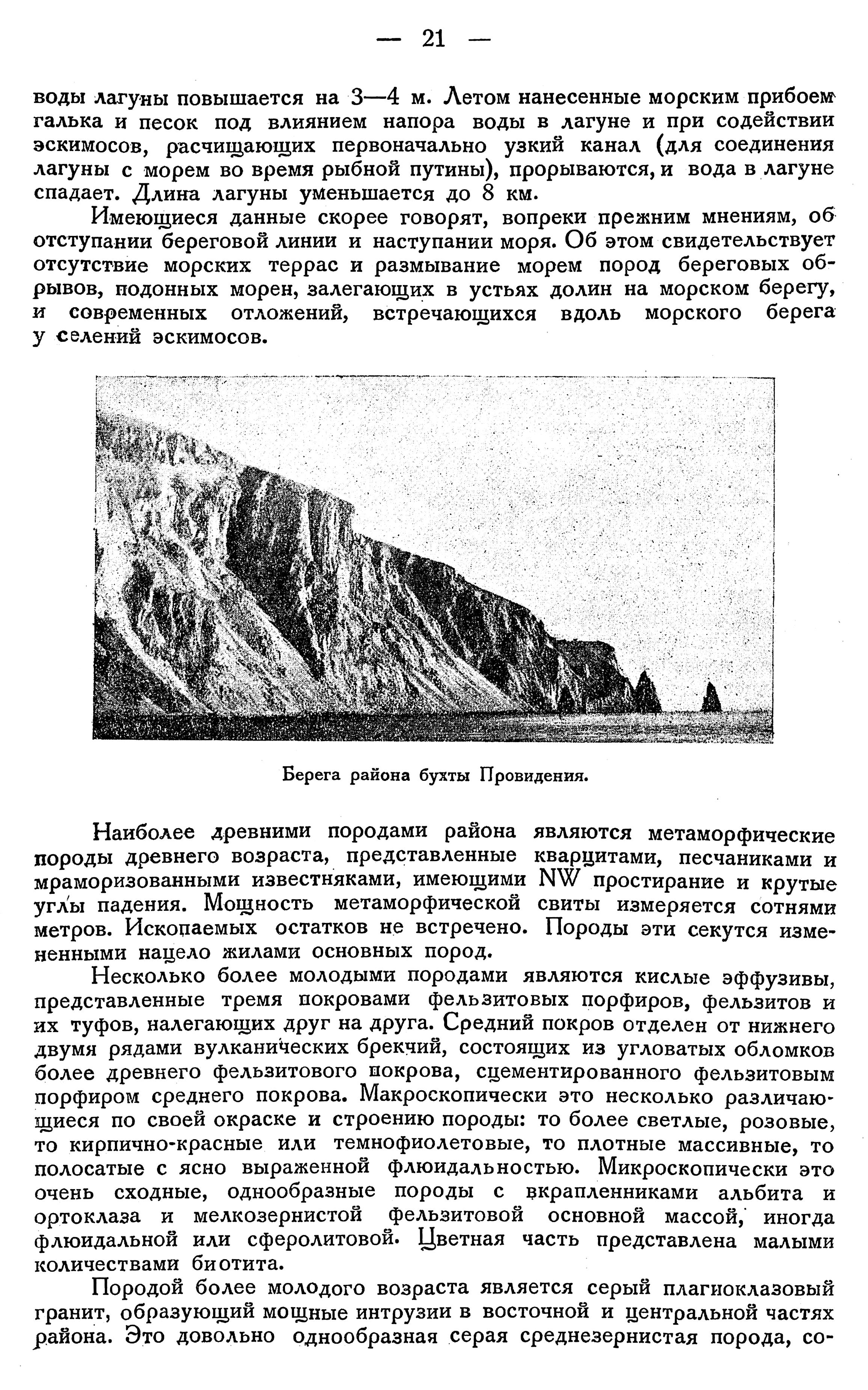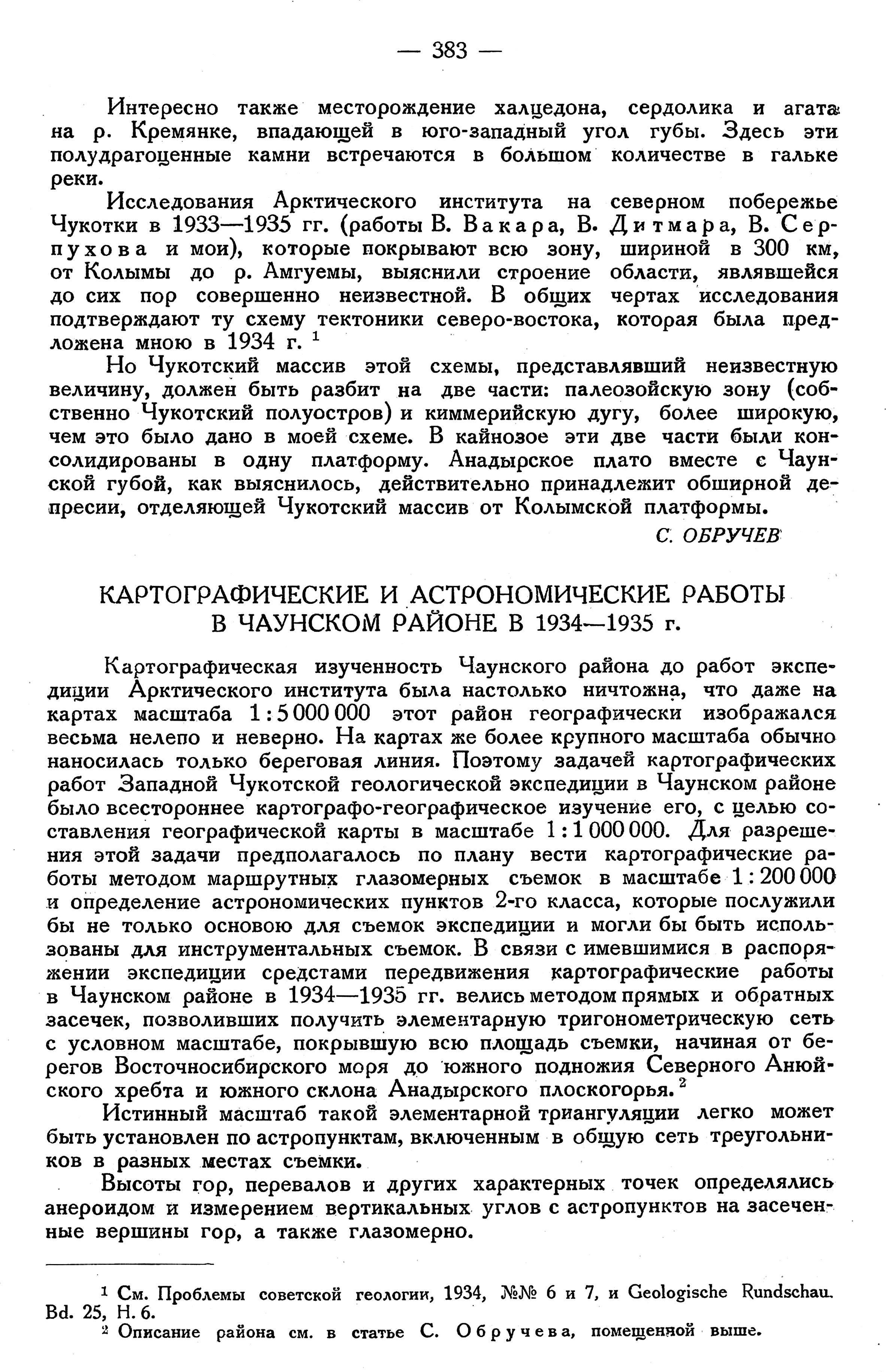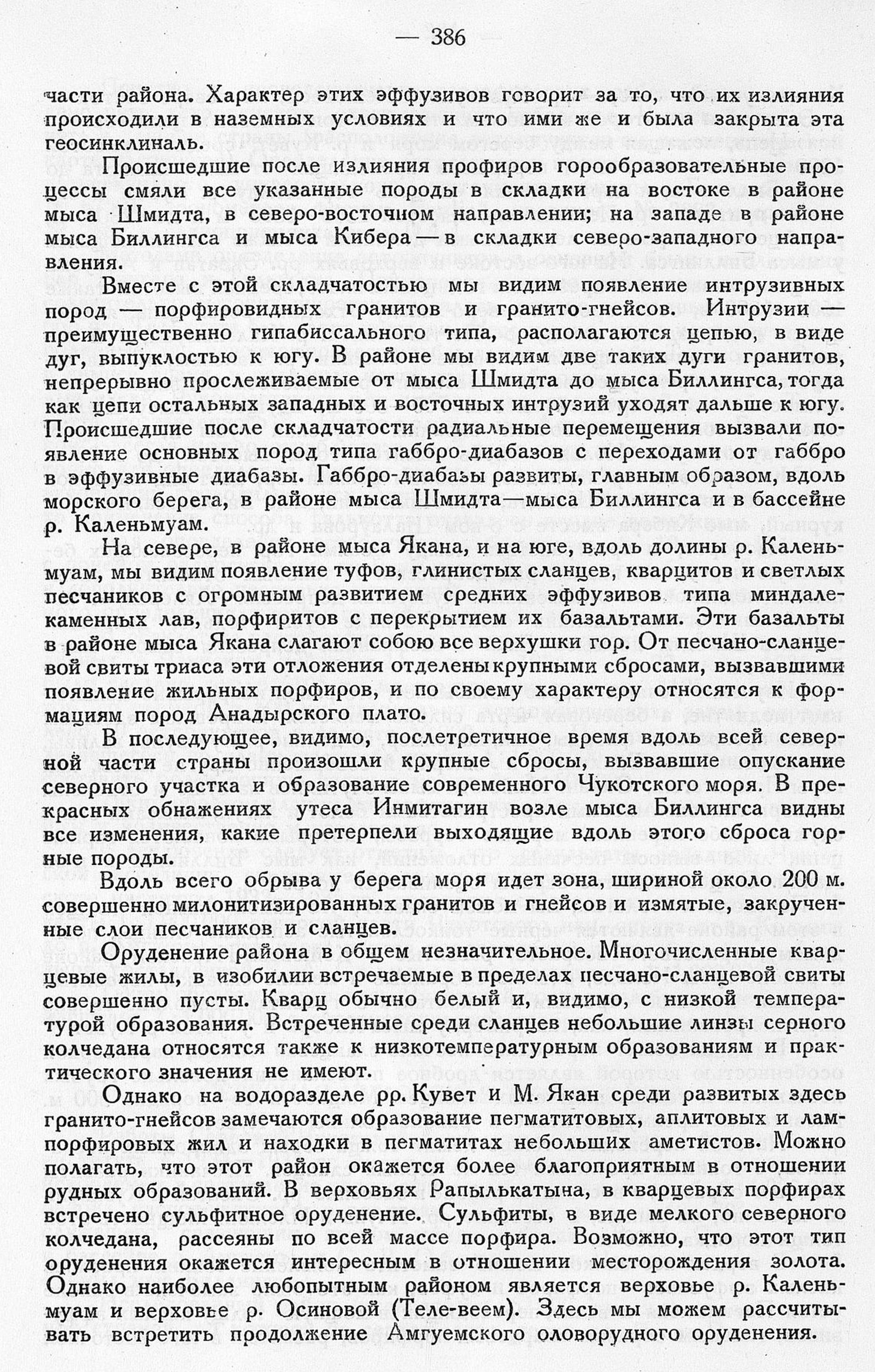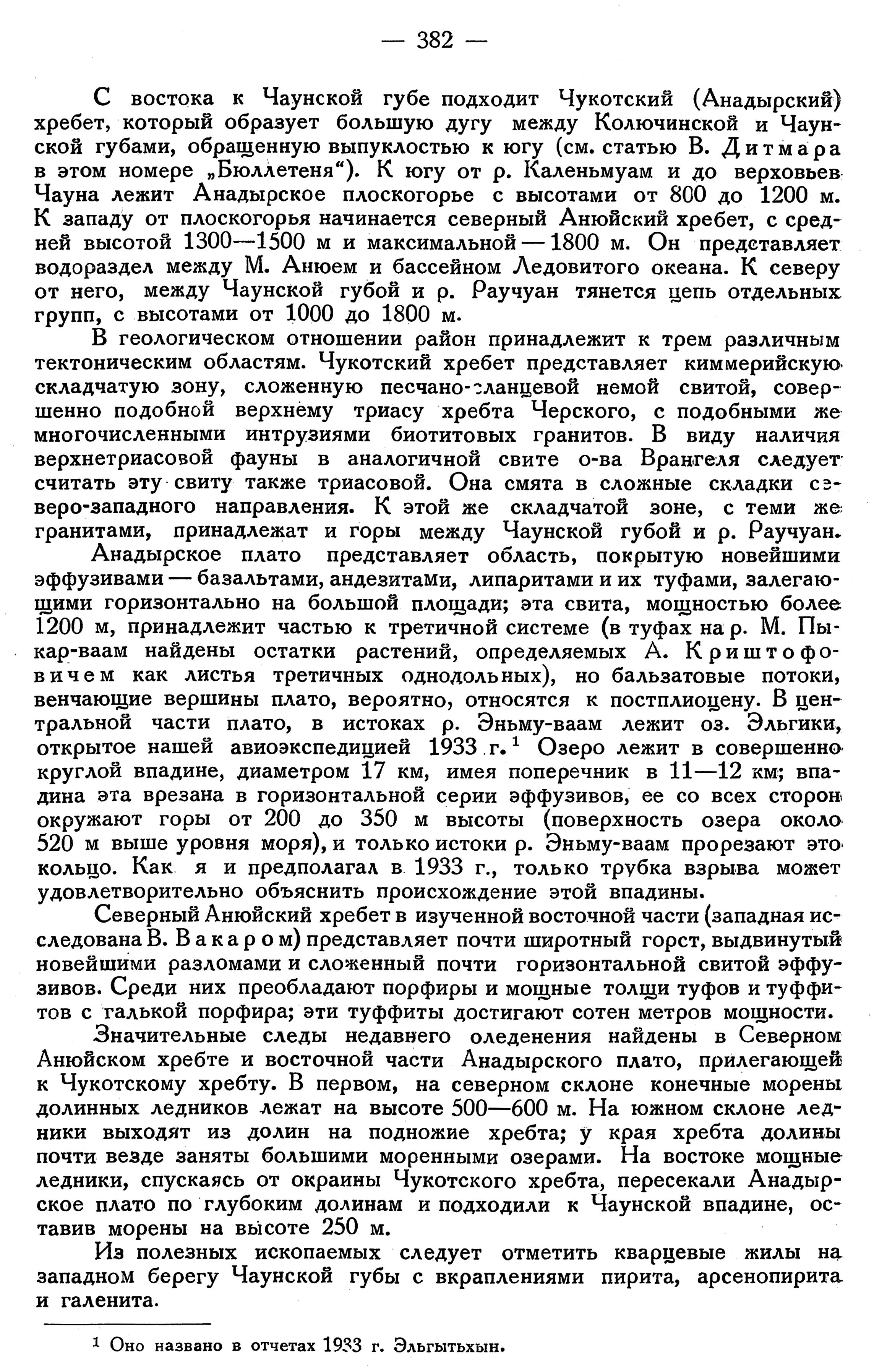 Исследования Арктического института на северном побережье Чукотки в 1933—1935 гг. (работы В. Вакара, В. Дитмара, В. Серпухова и мои), которые покрывают всю зону, шириной в 300 км, от Колымы до р. Амгуемы, выяснили строение области, являвшейся до сих пор совершенно неизвестной. В общих чертах исследования подтверждают ту схему тектоники северо-востока, которая была предложена мною в 1934 г. {1}