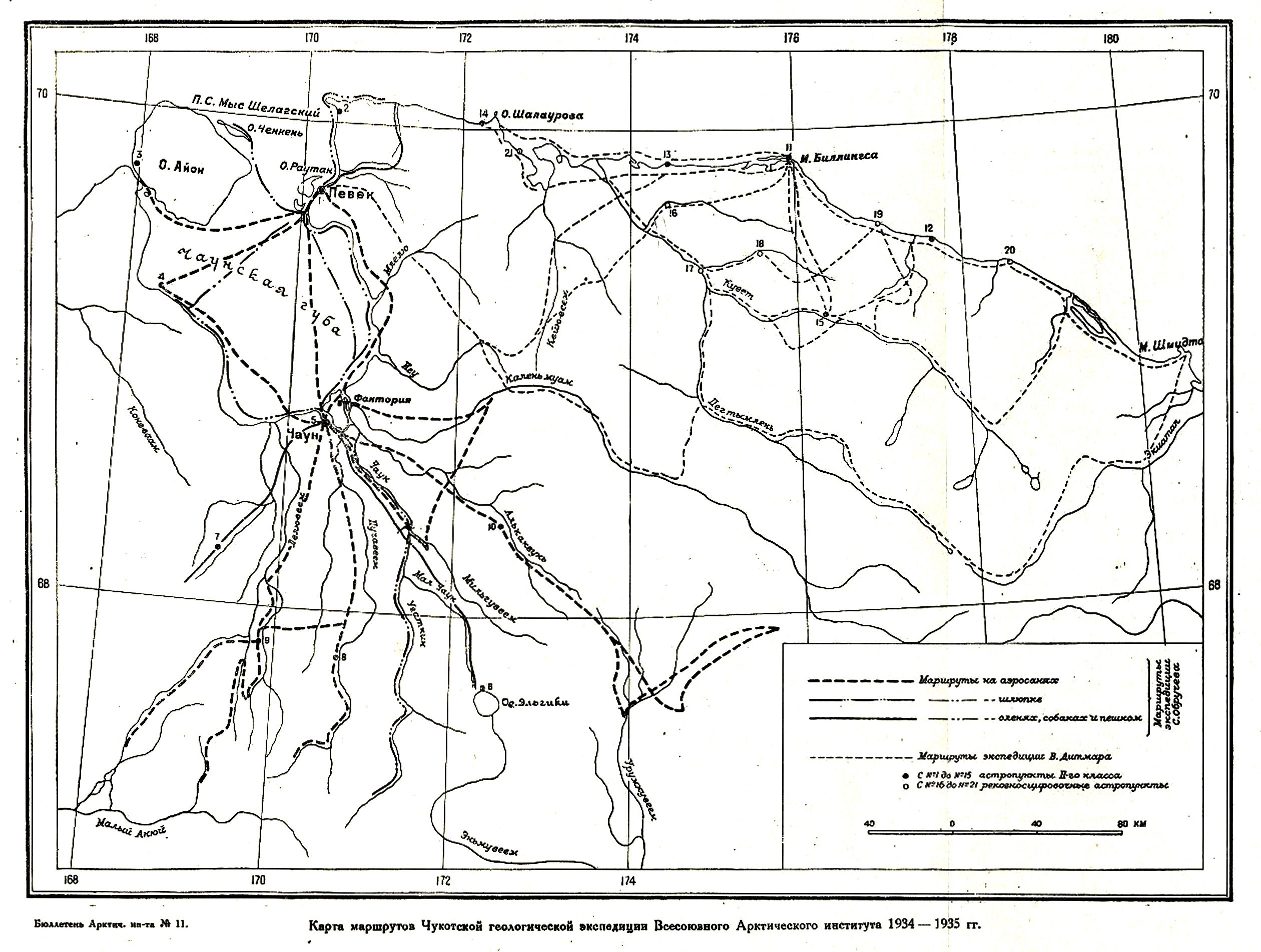 Карта маршрутов Чукотской геологической экспедиции Всесоюзного Арктического института 1934—1935 гг.