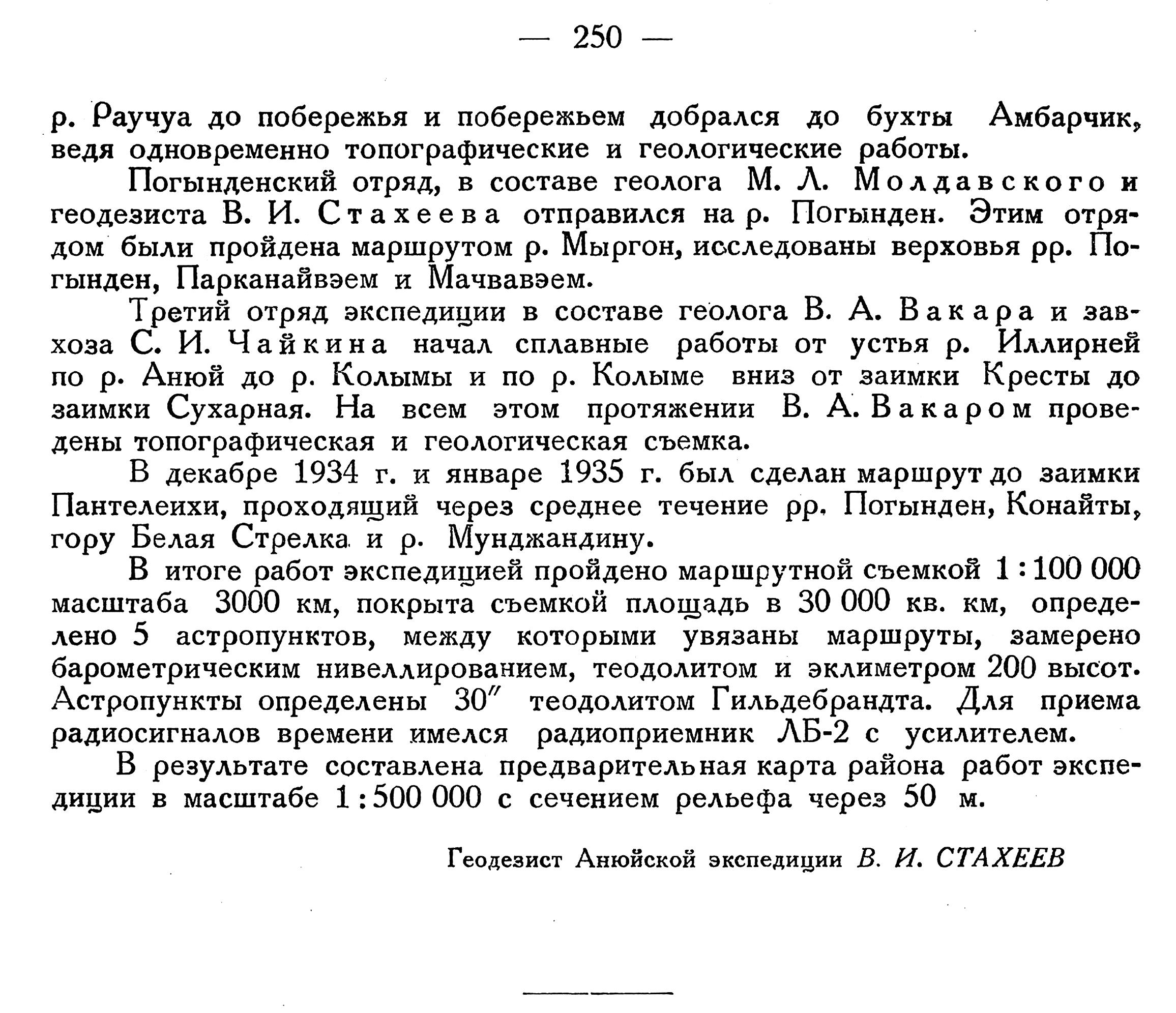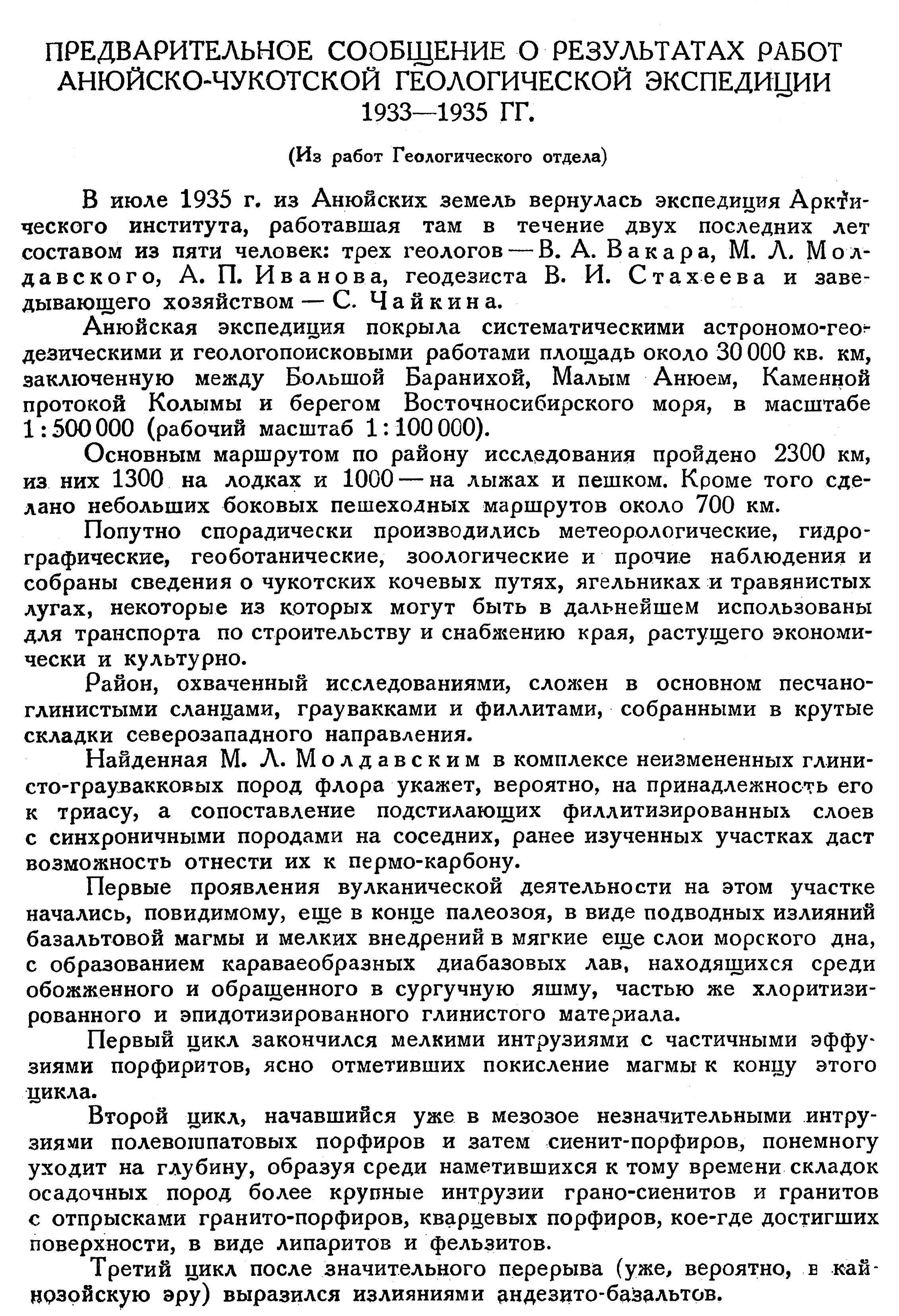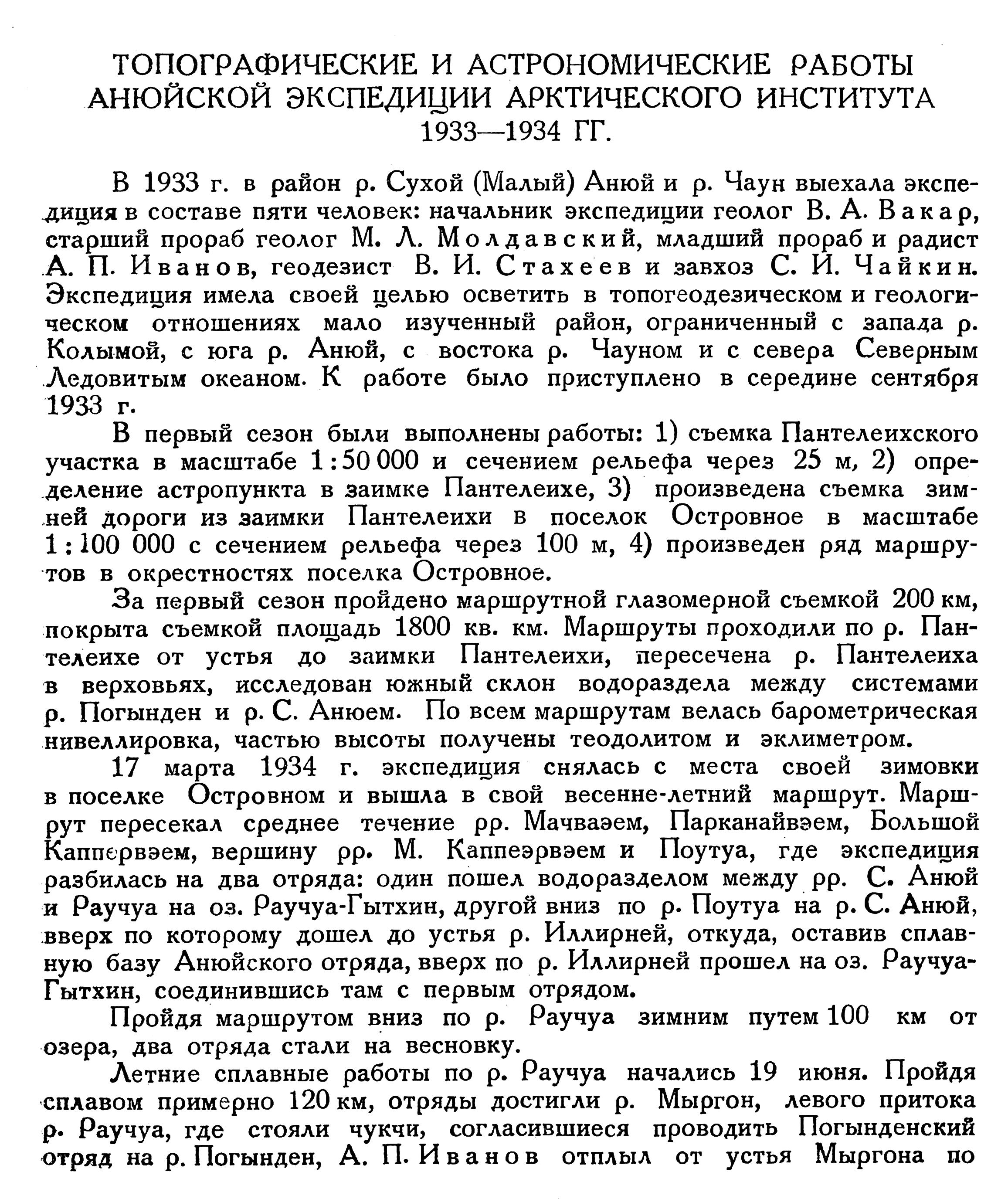 В июле 1935 г. из Анюйских земель вернулась экспедиция Арктического института, работавшая там в течение двух последних лет составом из пяти человек: трех геологов — В. А. Вакара, М. Л. Молдавского, А. П. Иванова, геодезиста В. И. Стахеева и заведывающего хозяйством — С. Чайкина.