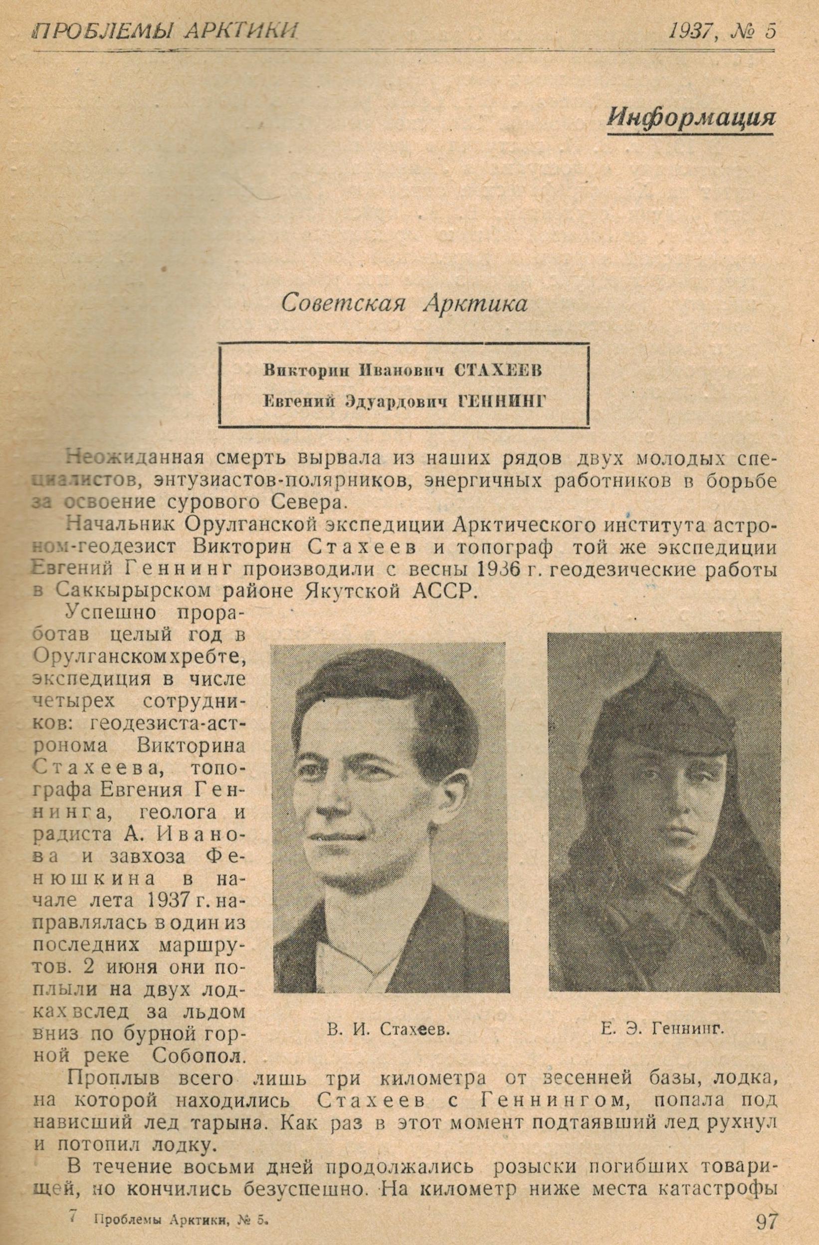 Начальник Орулганской экспедиции Арктического института астроном-геодезист Викторин Стахеев и топограф той же экспедиции Евгений Геннинг производили с весны 1936 г. геодезические работы в Саккырырском районе Якутской АССР.