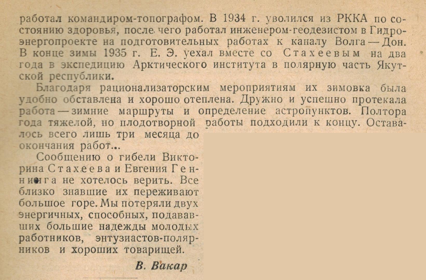 Сообщению о гибели Викторина Стахеева и Евгения Геннинга не хотелось верить. Все близко знавшие их переживают большое горе. Мы потеряли двух энергичных, способных, подававших большие надежды молодых работников, энтузиастов-полярников и хороших товарищей.