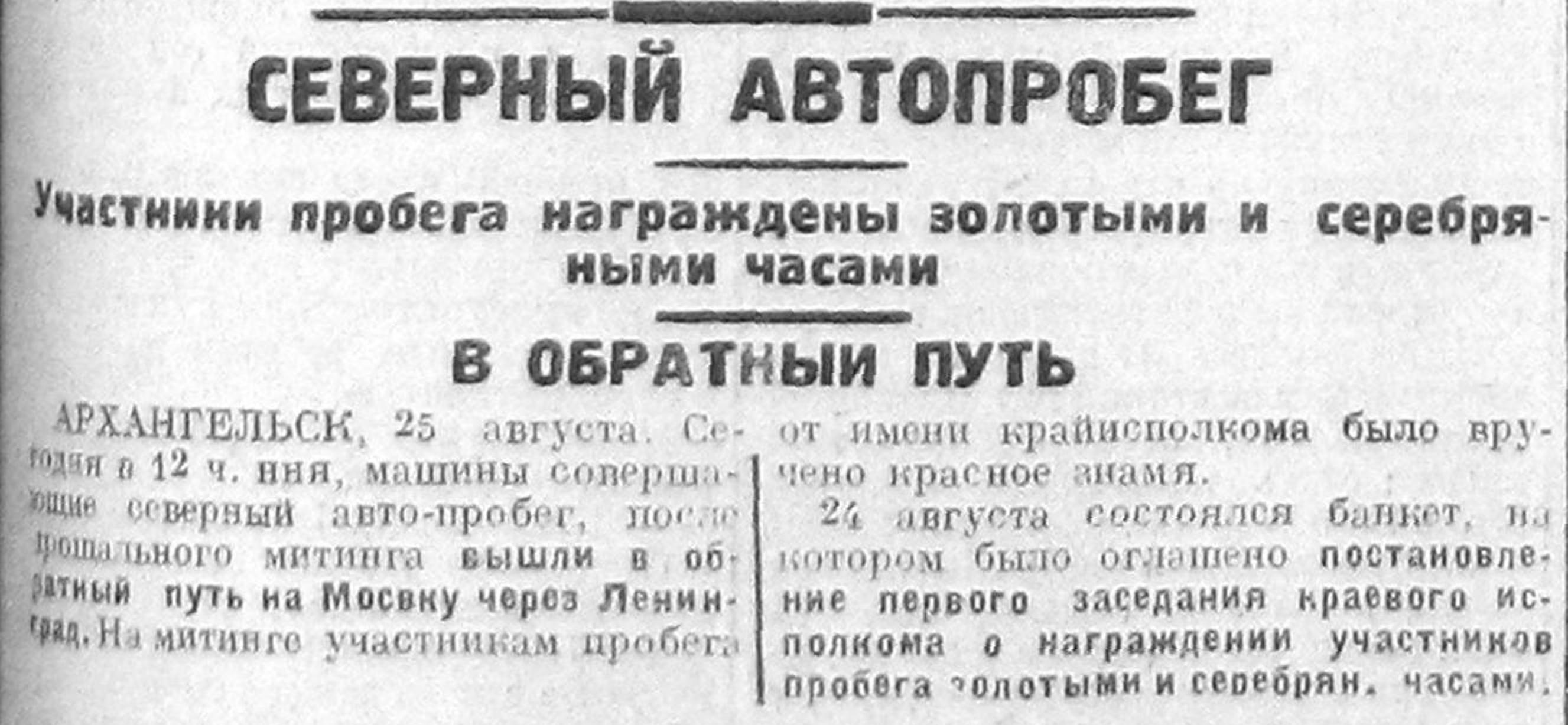 Центральный совет о-ва «Автодор» и ряд заинтересованных организаций устраивают 1-й северный авто-мото-пробег, в котором примут участие американские и наши советские автомобили. Этот пробег должен выявить выносливость разных машин и их проходимость, а также выгодность эксплоатации автомобилей и мотоциклов в условиях севера.