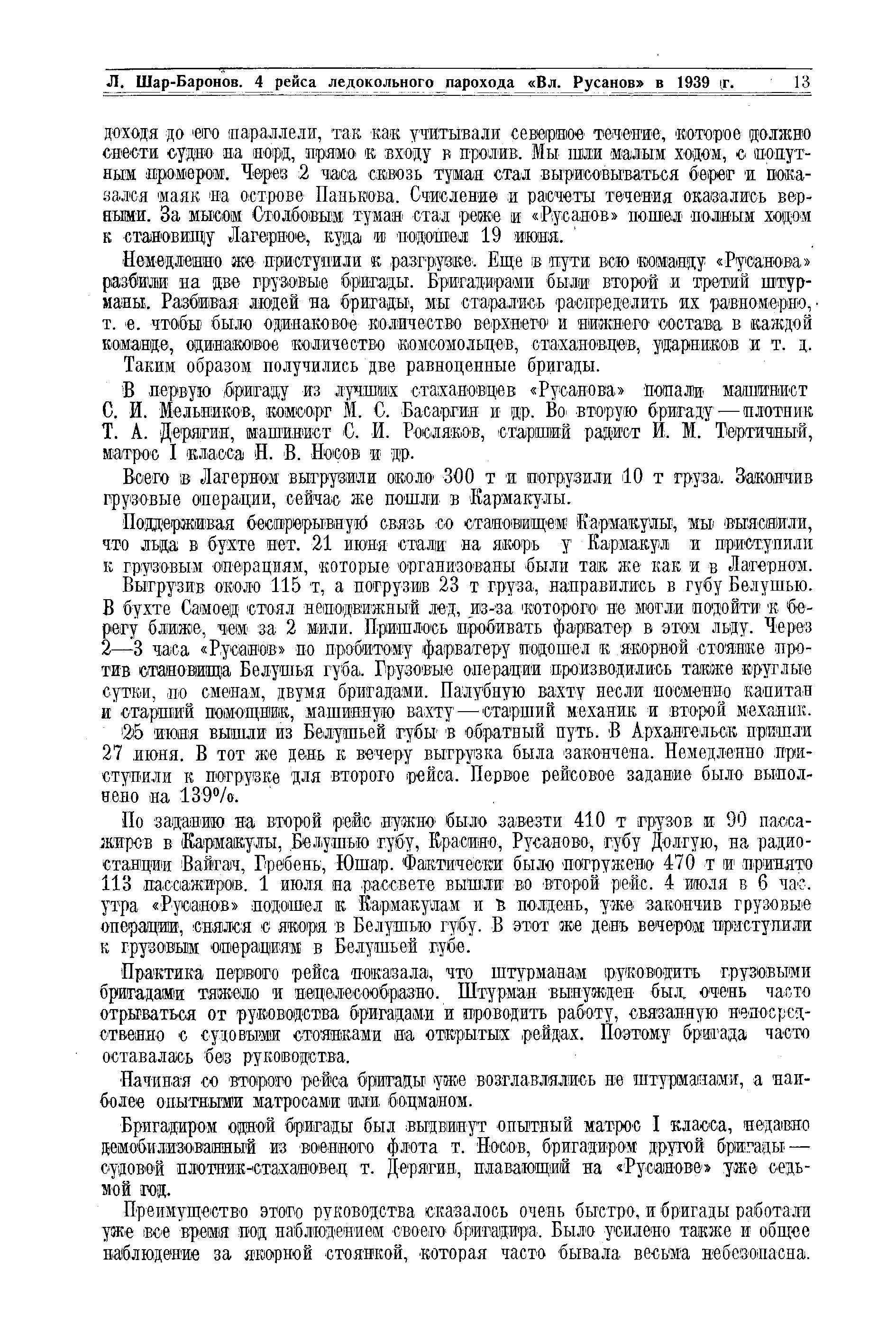 В первую бригаду из лучших стахановцев «Русанова» попали машинист С. И. Мельников, комсорг М. С. Басаргин и др. Во вторую бригаду — плотник Т. А. Дерягин, машинист С. И. Росляков, старший радист И. М. Тертичный, матрос I класса Н. В. Носов и др.