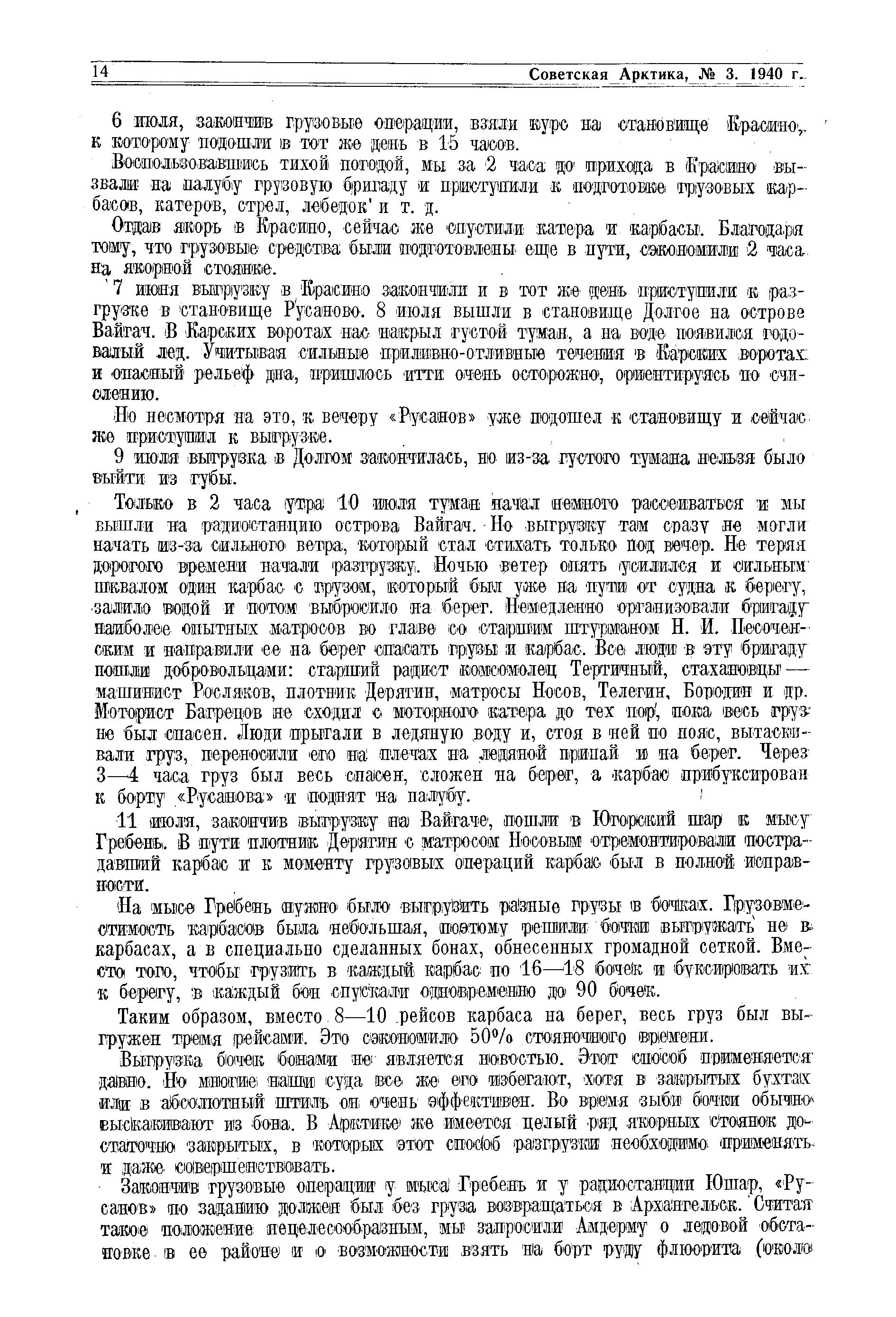Только в 2 часа утра 10 июля туман начал немного рассеиваться и мы вышли на радиостанцию острова Вайгач. Но выгрузку там сразу не могли начать из-за сильного ветра, который стал стихать только под вечер. Не теряя дорогого времени начали разгрузку. Ночью ветер опять усилился и сильным шквалом один карбас с грузом, который был уже на пути от судна к берегу, залило водой и потом выбросило на берег. Немедленно организовали бригаду наиболее опытных матросов во главе со старшим штурманом Н. И. Песоченским и направили ее на берег спасать грузы и карбас. Все люди в эту бригаду пошли добровольцами: старший радист комсомолец Тертичный, стахановцы — машинист Росляков, плотник Дерягин, матросы Носов, Телегин, Бородин и др. Моторист Багрецов не сходил с моторного катера до тех пор, пока весь груз не был спасен. Люди прыгали в ледяную воду и, стоя в ней по пояс, вытаскивали груз, переносили его на плечах на ледяной припай и на берег. Через 3—4 часа груз был весь спасен, сложен на берег, а карбас прибуксирован к борту «Русанова» и поднят на палубу.