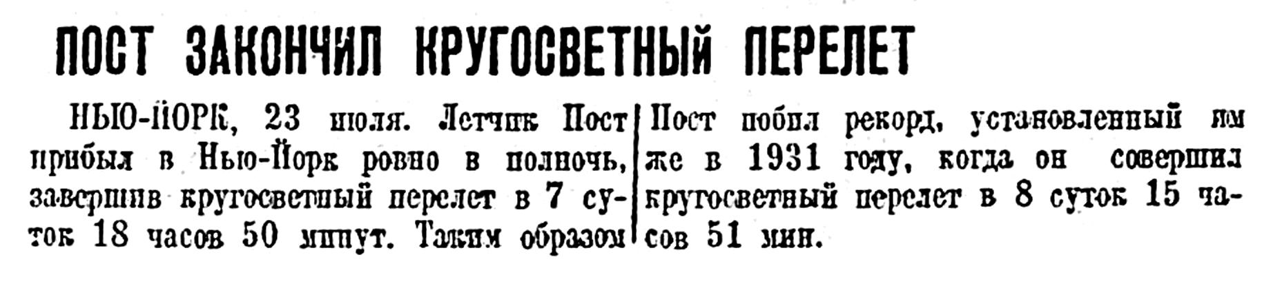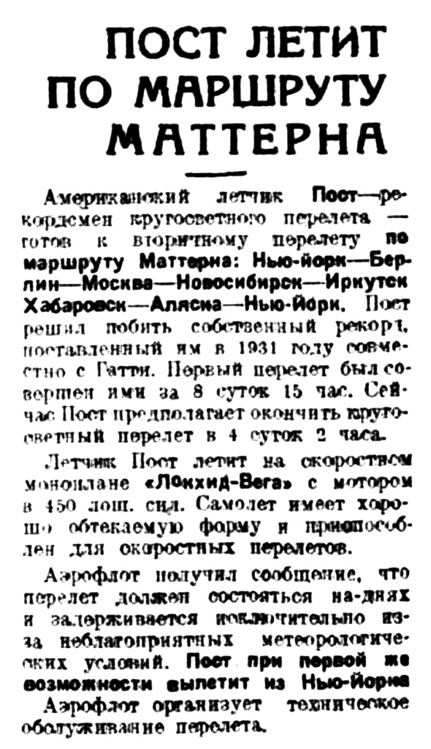 Несмотря на две вынужденные посадки, Пост покрыл весь путь от Нью-Йорка до Москвы в 49 часов вместе с остановками, тогда как в 1931 г. это же расстояние Пост и Гетти покрыли в 55 час. 35 мин. Таким образом к моменту прибытия в Москву по сравнению с перелетом 1931 г. Пост выиграл во времени 6 часов 35 мин., сэкономив, кроме того. 8 час. 40 мин. на самой остановке (в Москве). В 1931 г. остановка Поста и Гетти в Москве отняла 11 ч. 40 мин. Вчерашняя остановка отняла у Поста всего лишь 2 час. 50 мин.