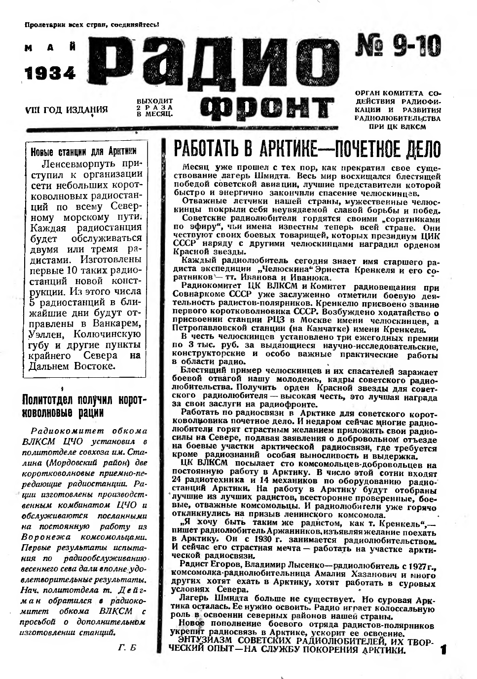 ЦК ВЛКСМ посылает сто комсомольцев-добровольцев на постоянную работу в Арктику. В число этой сотни входят 24 радиотехника и 14 механиков по оборудованию радиостанций Арктики. На работу в Арктику будут отобраны лучшие из лучших радистов, всесторонне проверенные, боевые, отважные комсомольцы. И радиолюбители уже горячо откликнулись на призыв ленинского комсомола.
