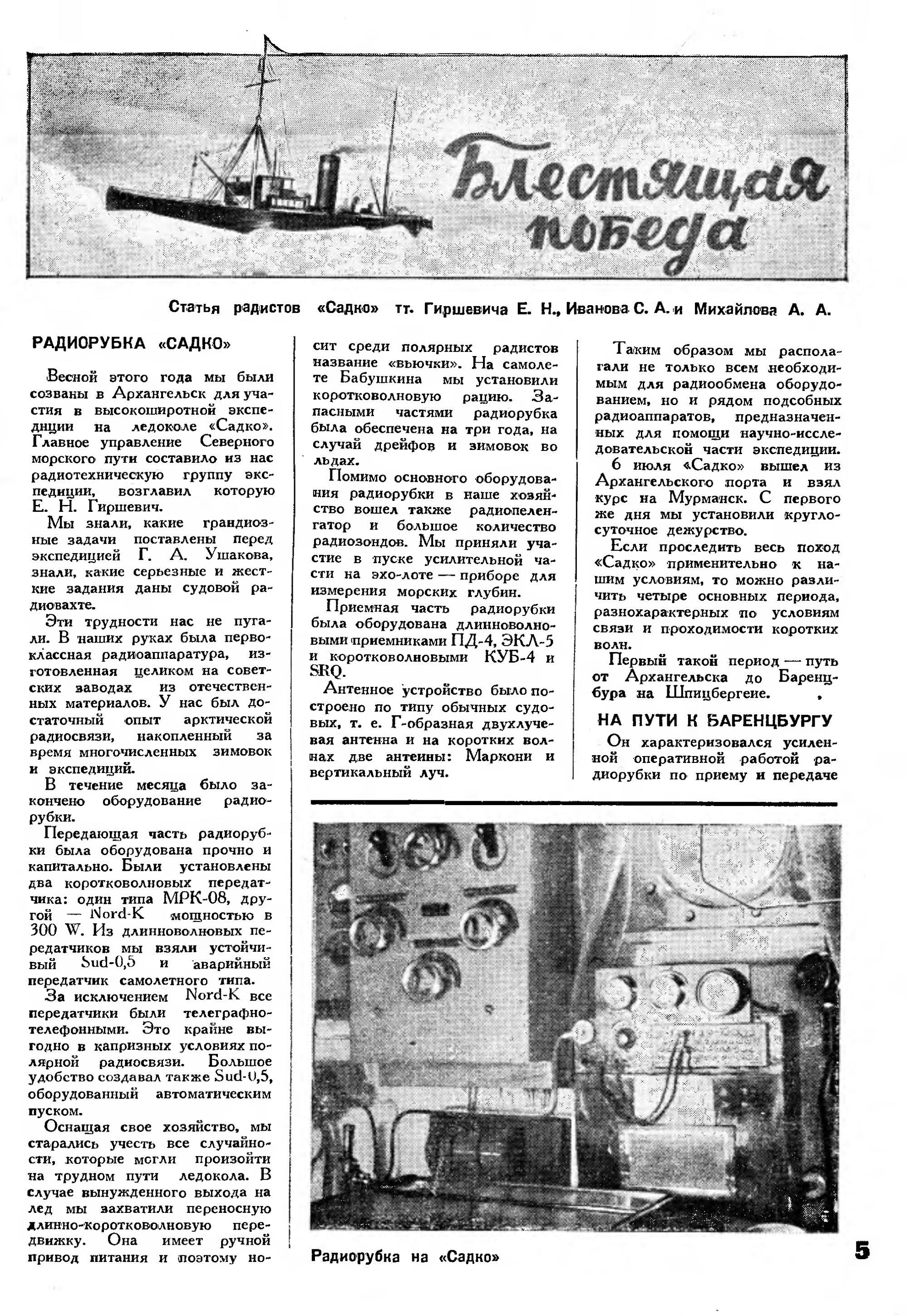 Статья радистов «Садко» тт. Гиршевича Е. Н., Иванова С. А. и Михайлова А. А.