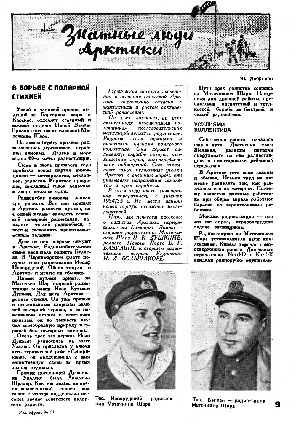 Радист Егоров Владимир Лысенко—радиолюбитель с 1927 г., комсомолка-радиолюбительница Амалия Хазанович и много других хотят ехать в Арктику, хотят работать в суровых условиях Севера.
