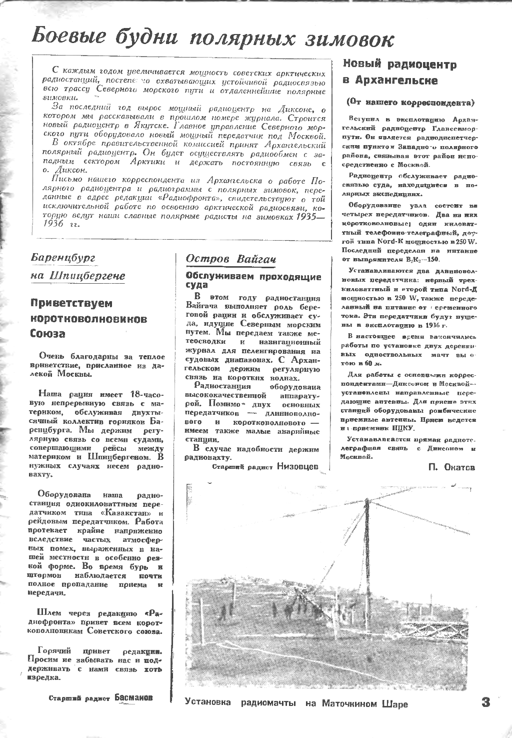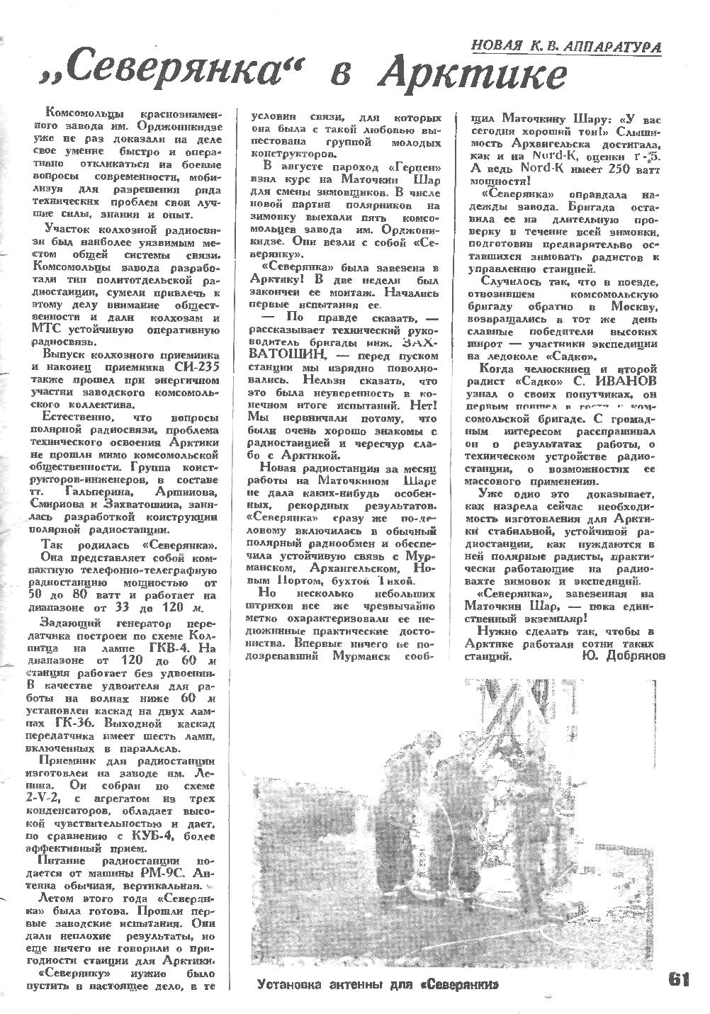 Советские радиолюбители вправе гордиться героями радиосвязи в Арктике, своими товарищами по приемнику и ключу. Только в нашей среде могут воспитываться такие отважные, смелые кадры радистов, радиосигналами покрывающих большие расстояния Арктики.
