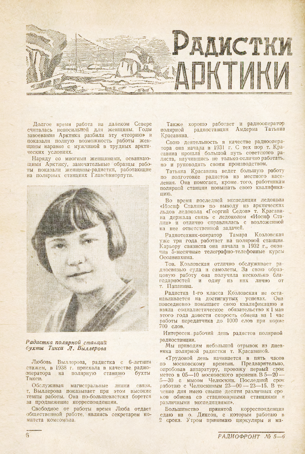 Радио привлекает внимание наших советских девушек. Повседневно растет число кружков, в которых девушки изучают радиотехнику, овладевают второй профессией, профессией радиста. Так, радиошкола Метростроя за три года выпустила не один десяток девушек-радисток. Многие из них едут работать на радиостанции, расположенные в высокогорных районах и в отдаленных районах Дальнего Востока.